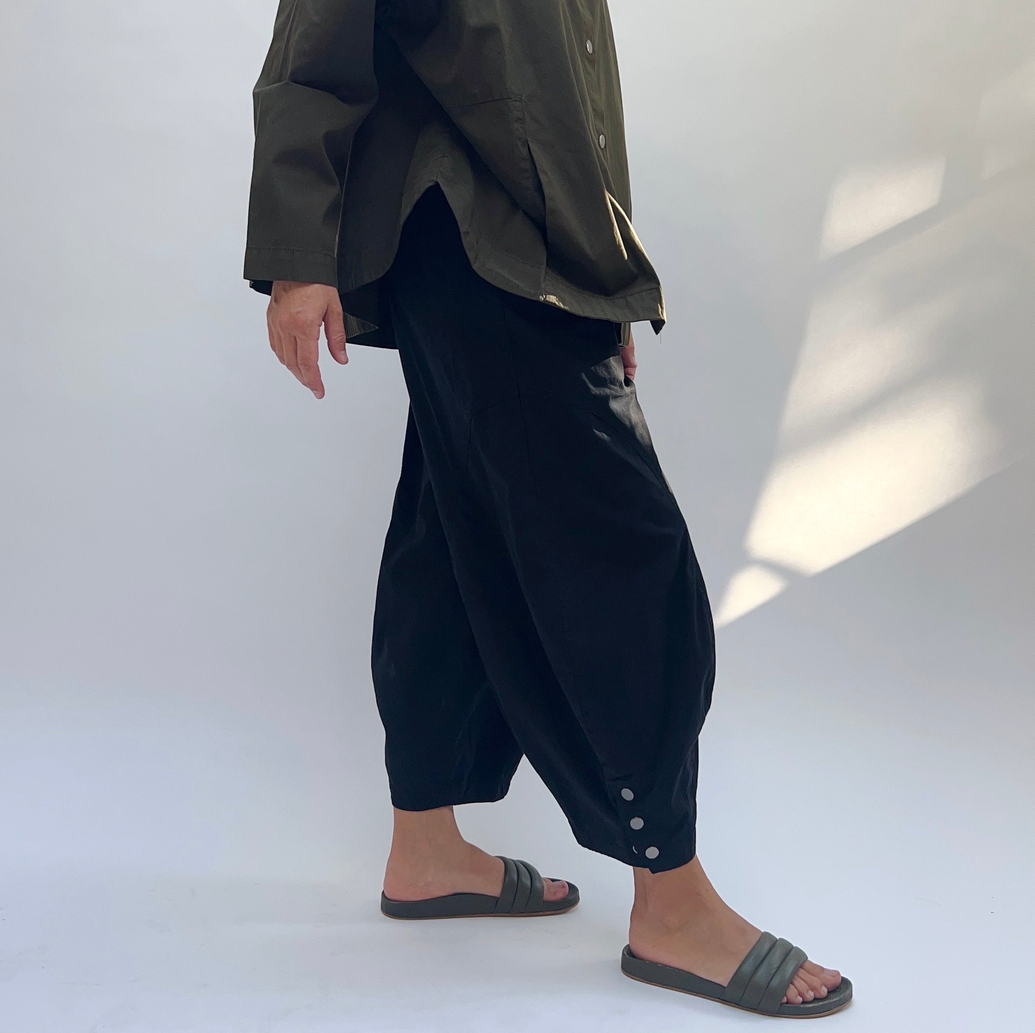 Perfectly cotton/lyocell pants featuring roomy pockets, an elastic waistband, side-seam detailing, and snap buttons at each ankle. These pants are comfortable while looking polished and cool - a pair you'll want to throw on again and again!