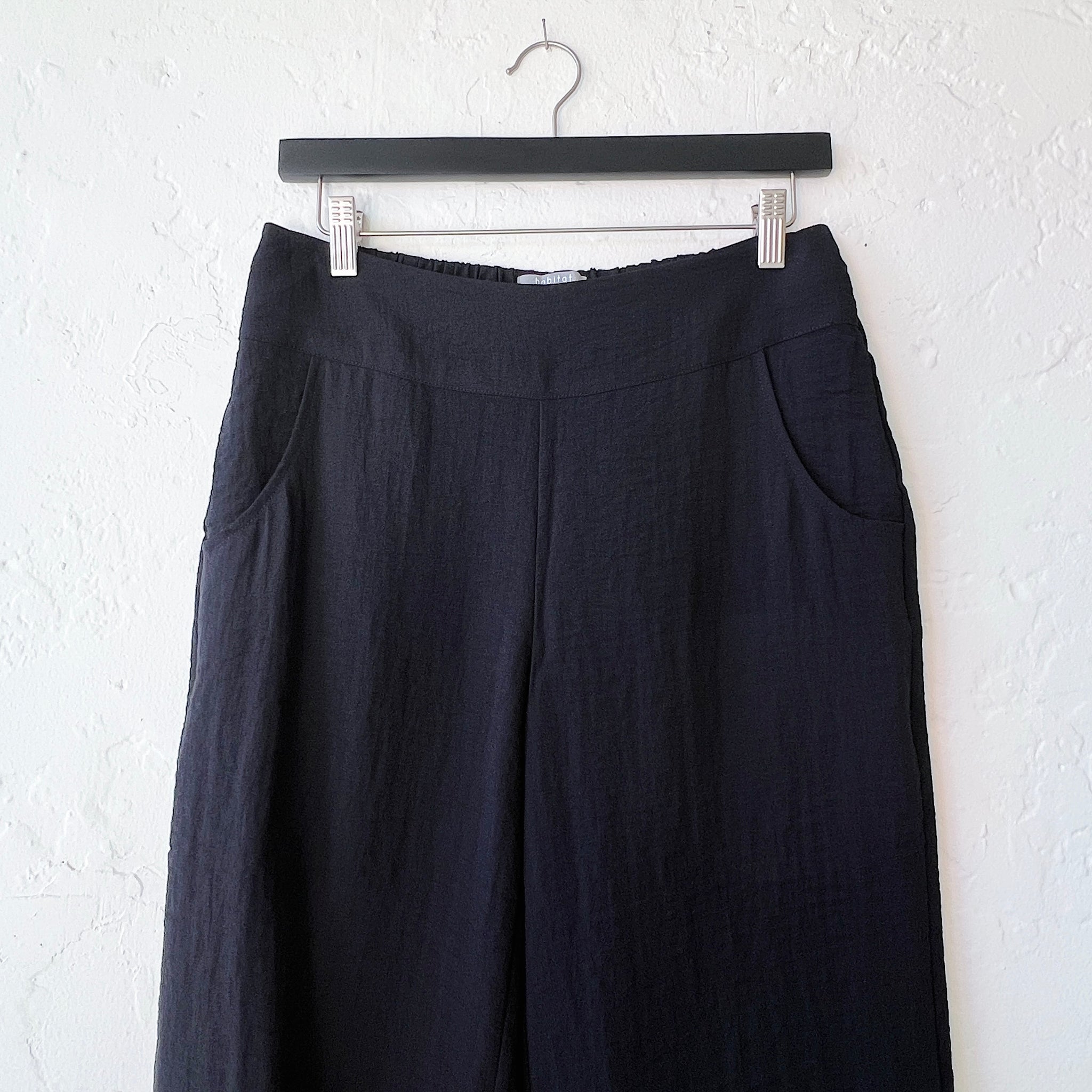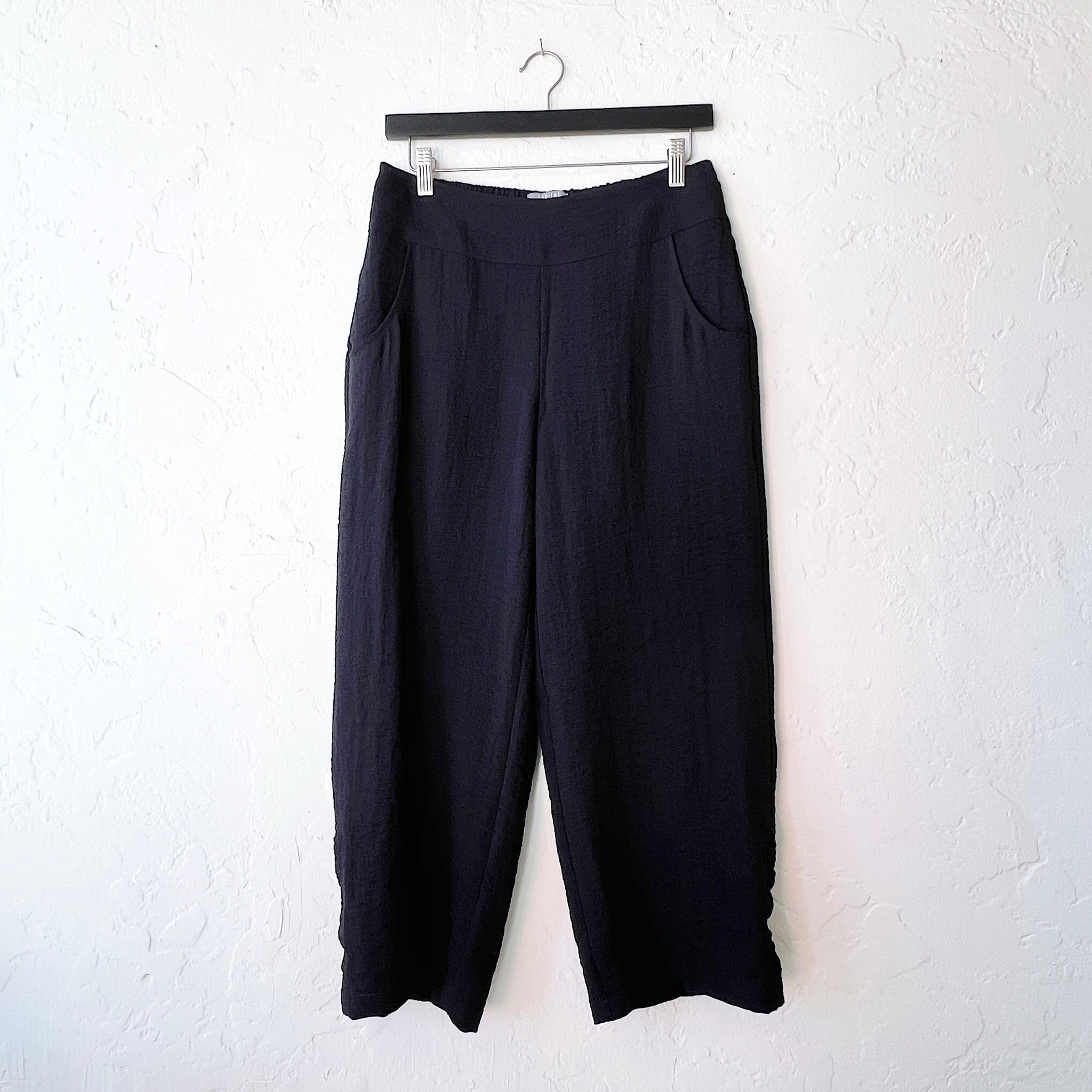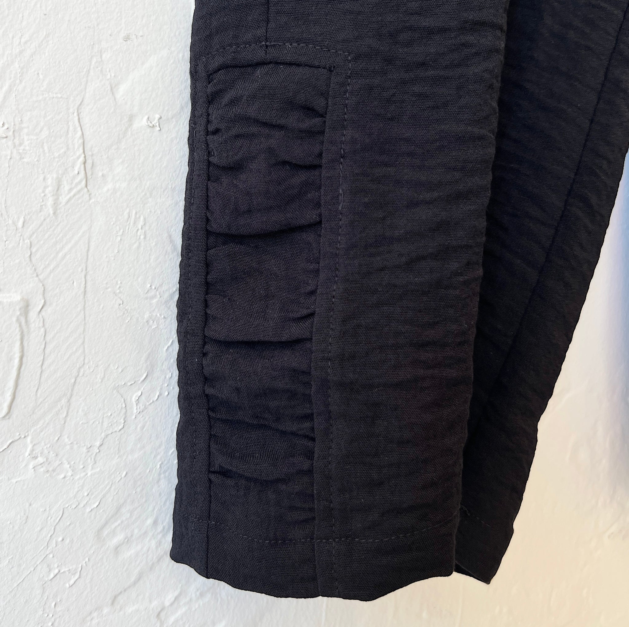 Travel friendly rayon, nylon blend with a slightly textured crinkle effect. Ruched detail at leg opening, built-in pockets, crop length, straight leg.