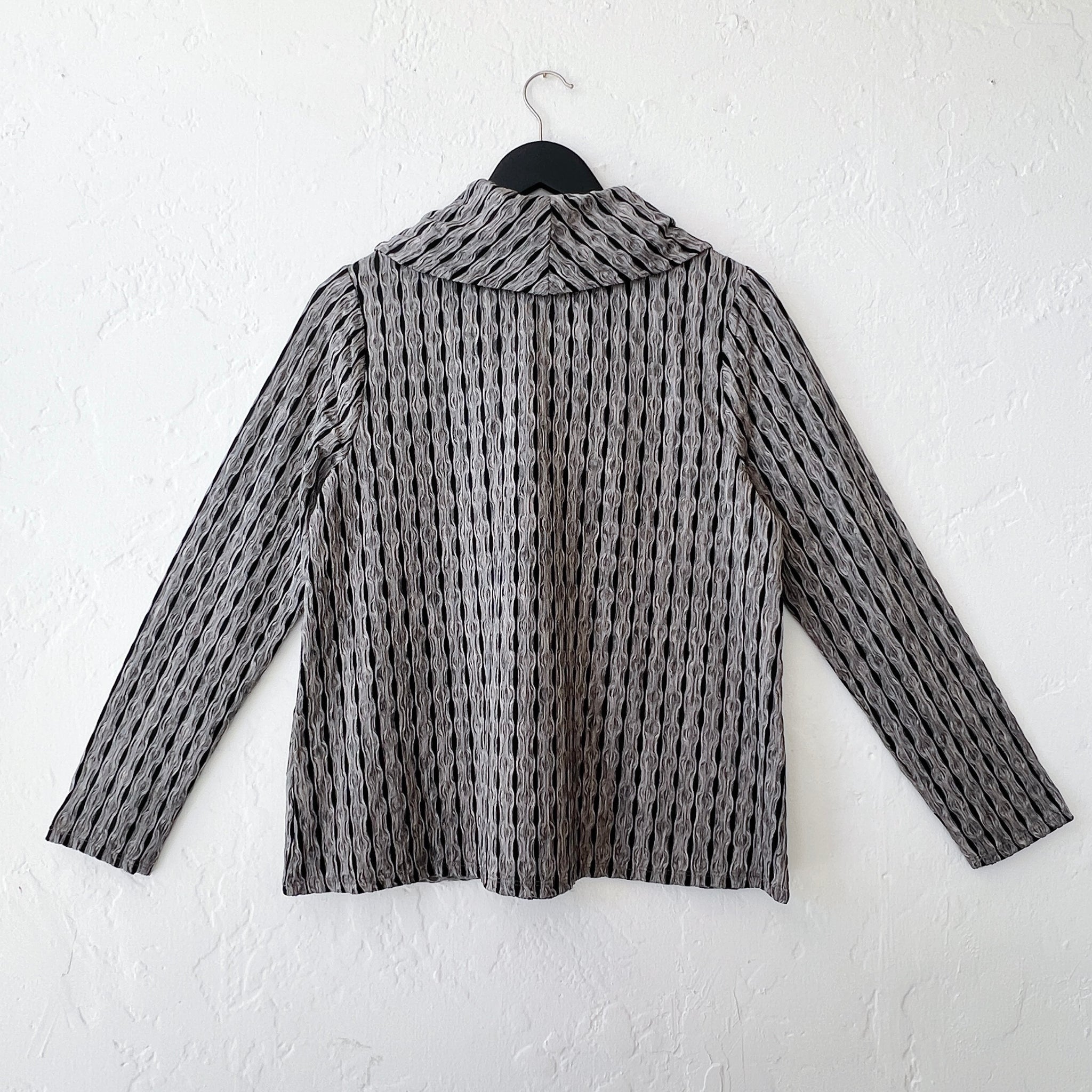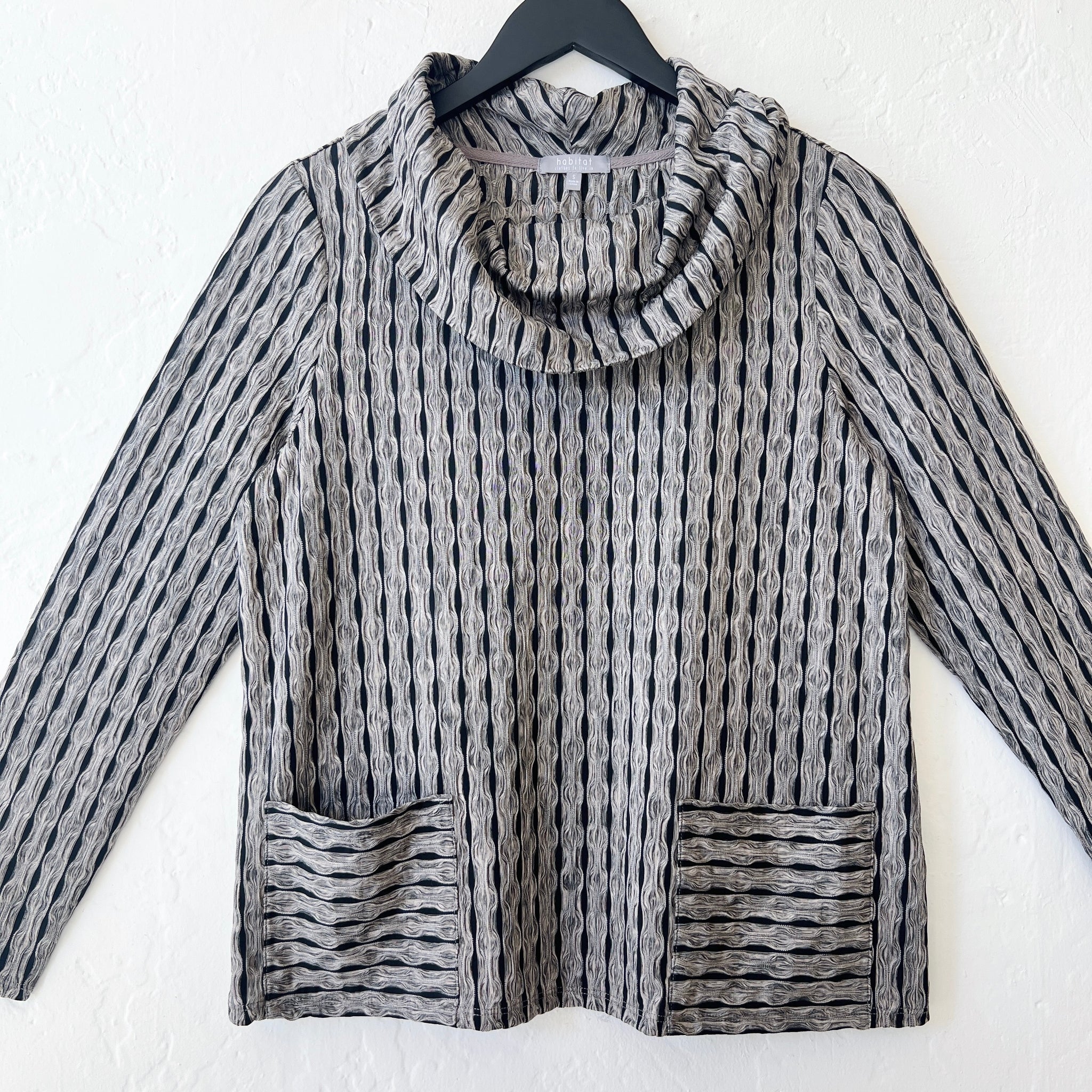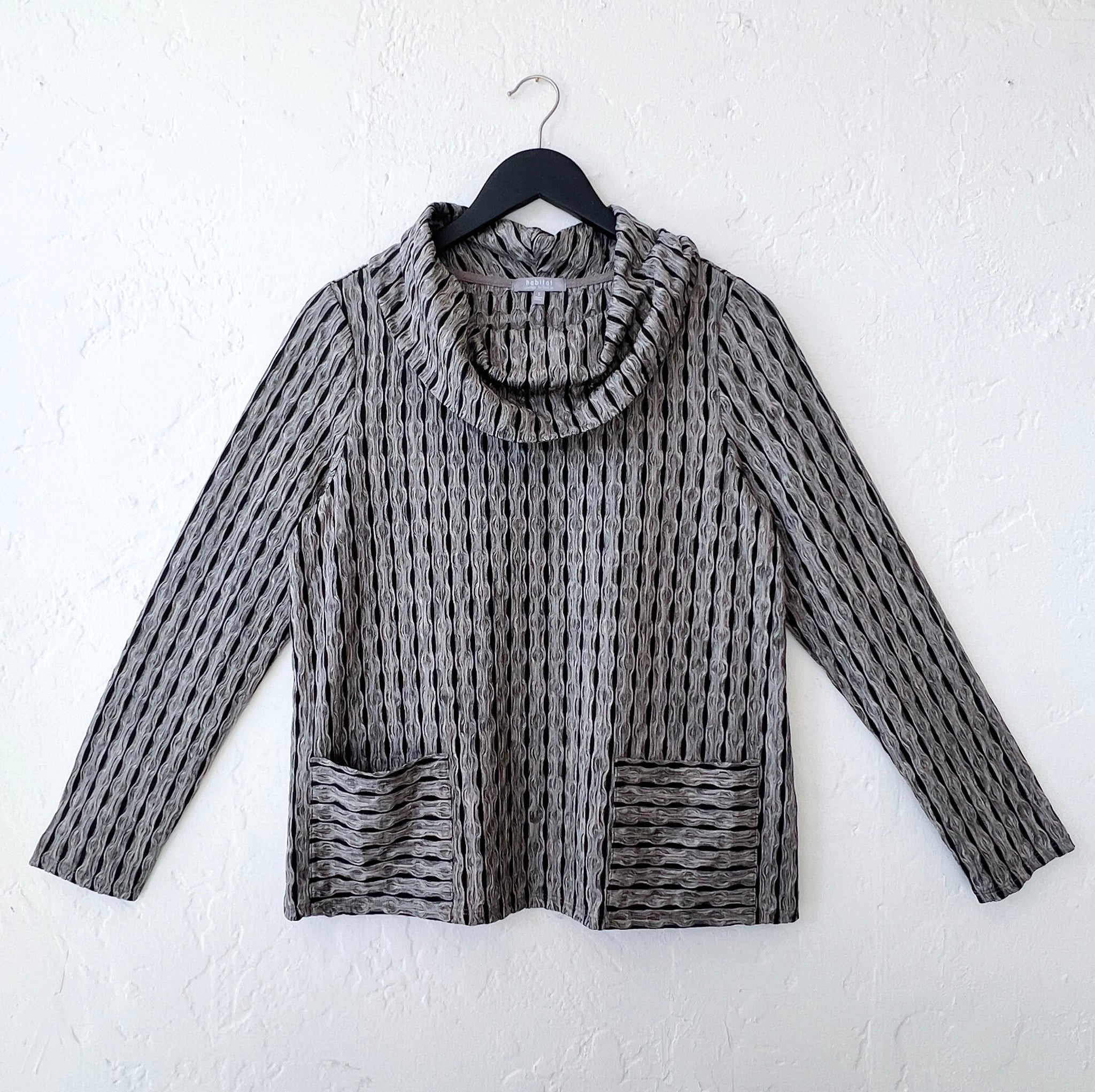 A textured long sleeve blouse featuring a cowl neck and double front pockets.