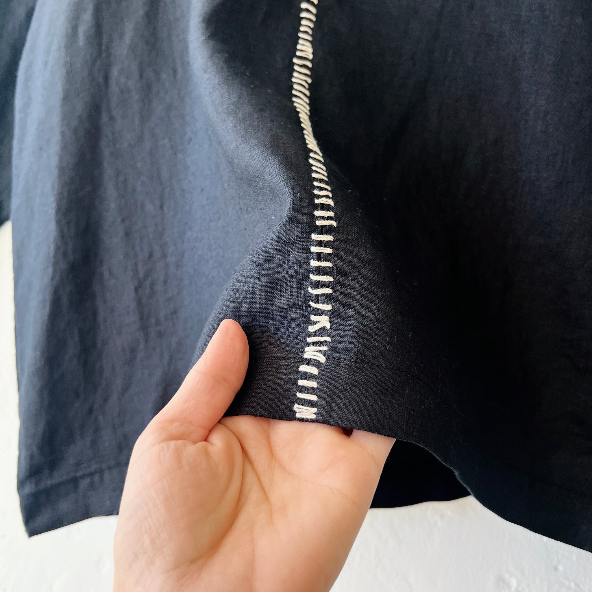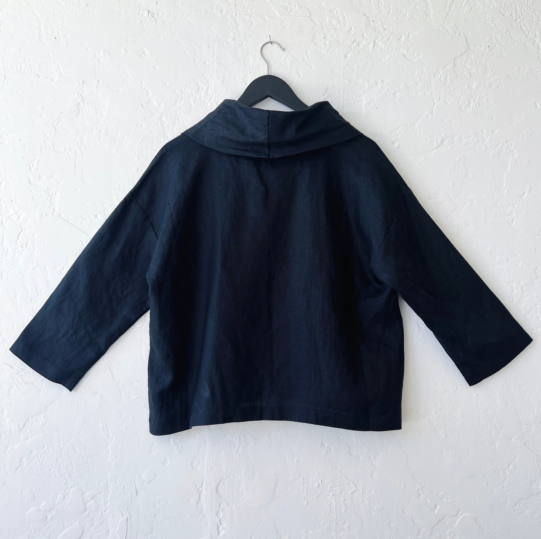 This blouse has a beautiful front hand-stitched detail and an organic cowl collar.