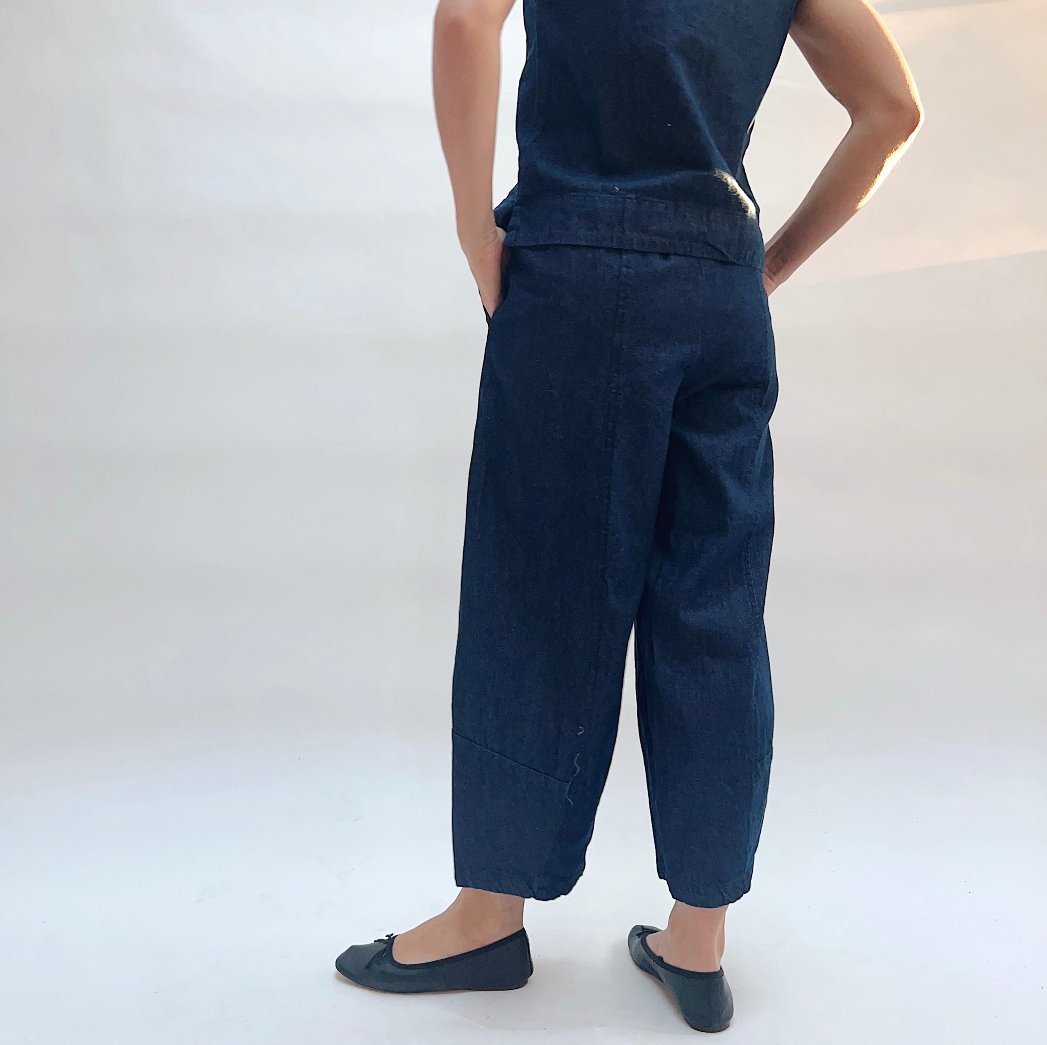 Our favorite linen lantern pants with curved leg seams, an elastic waistband, and two pockets at the hips - now in a light and breathable flax denim.