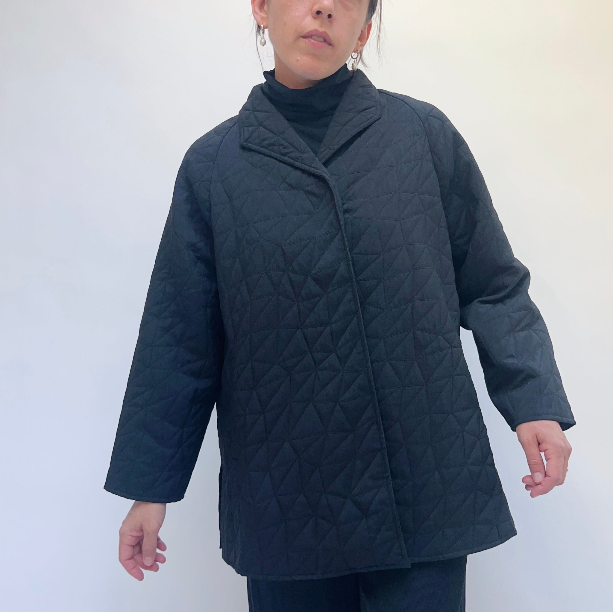 A mid-length coat with kaleidoscope quilting and magnetic buttons for a sleek look.