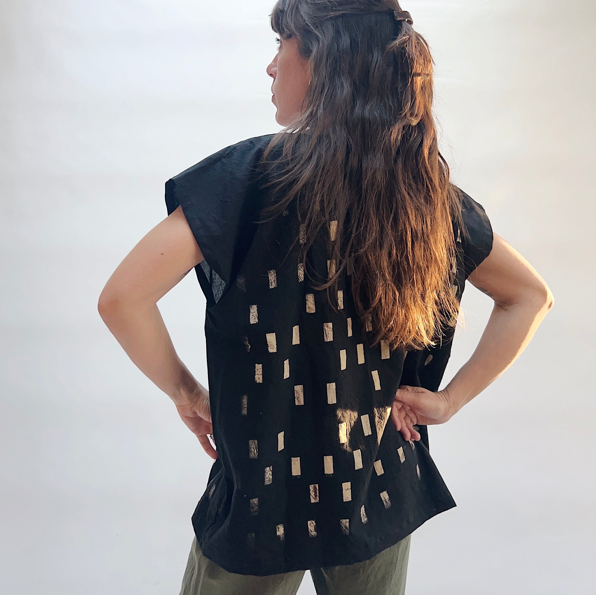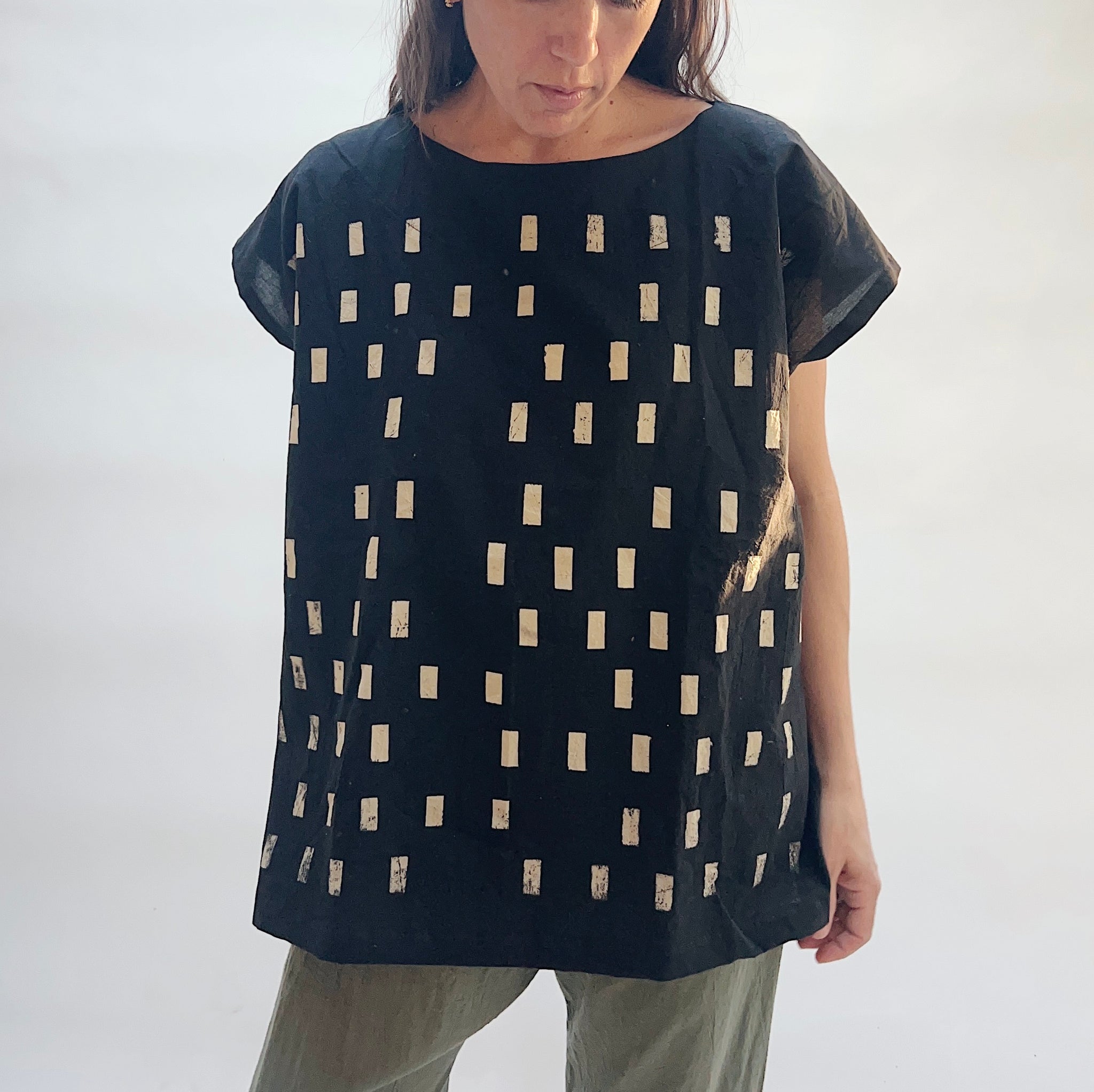 Loose-fitting tee with a beige dash printed on black fabric. Variations in screen printing are to be expected and part of the hand made nature of this fabric.