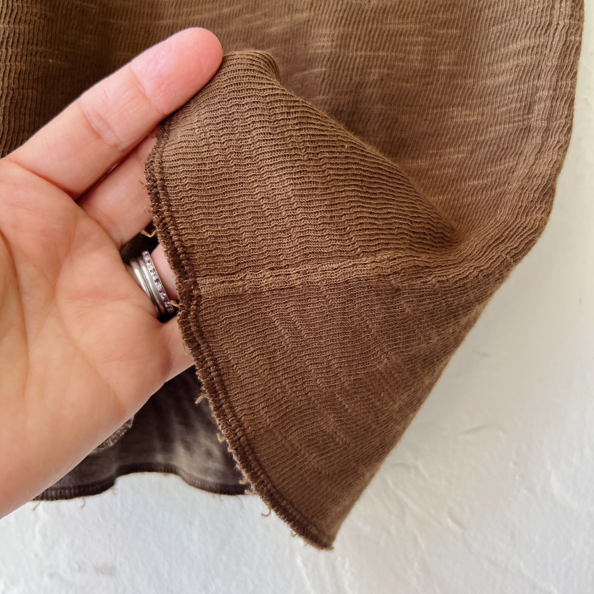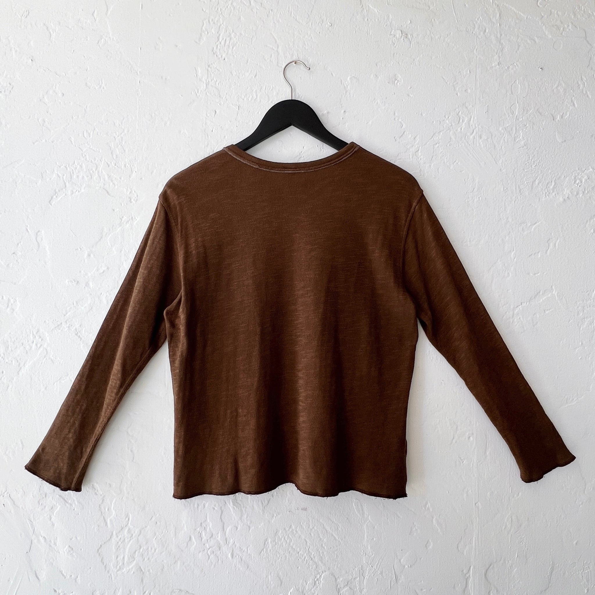 Cozy double-layered cotton top with raw hem neckline and slightly cropped sleeves.