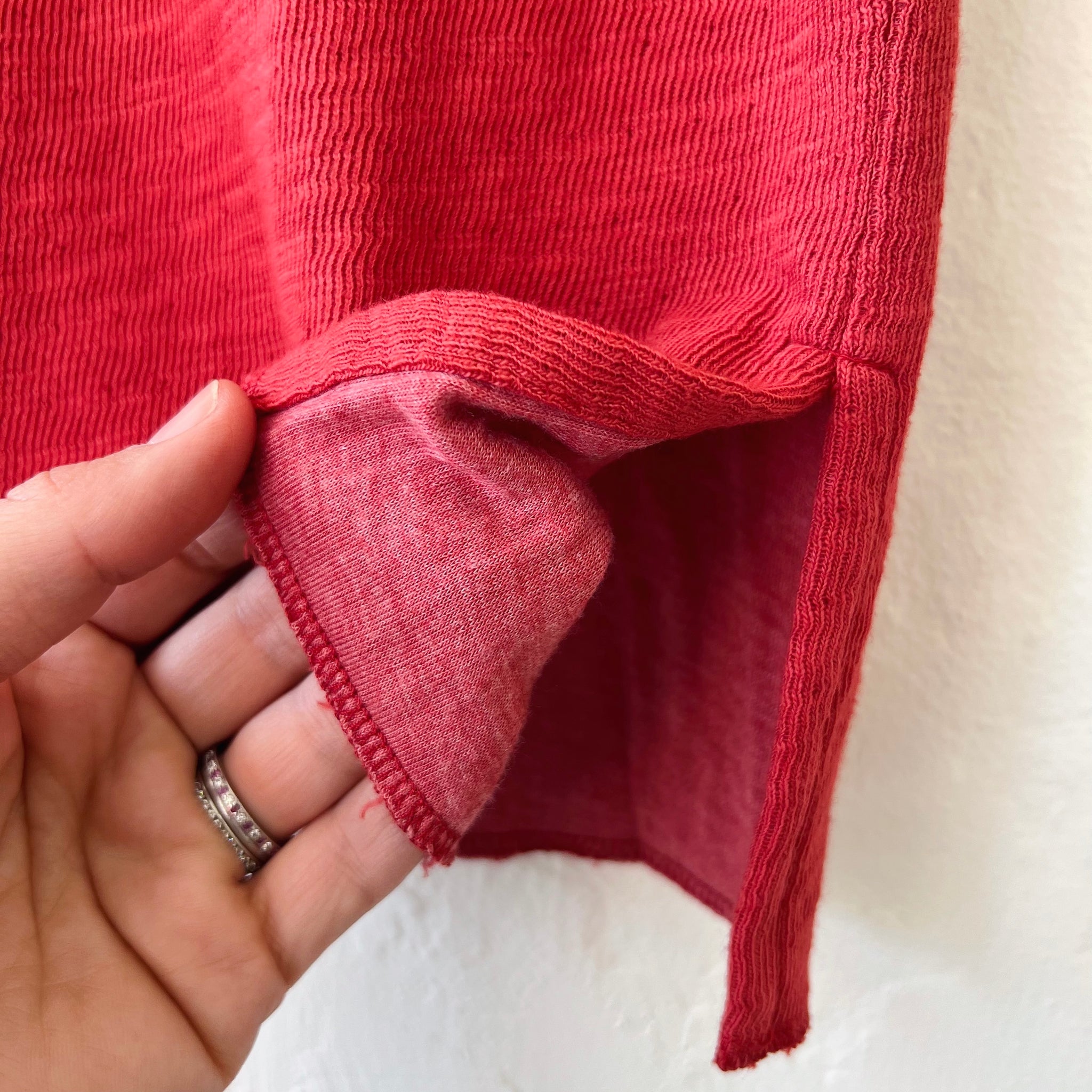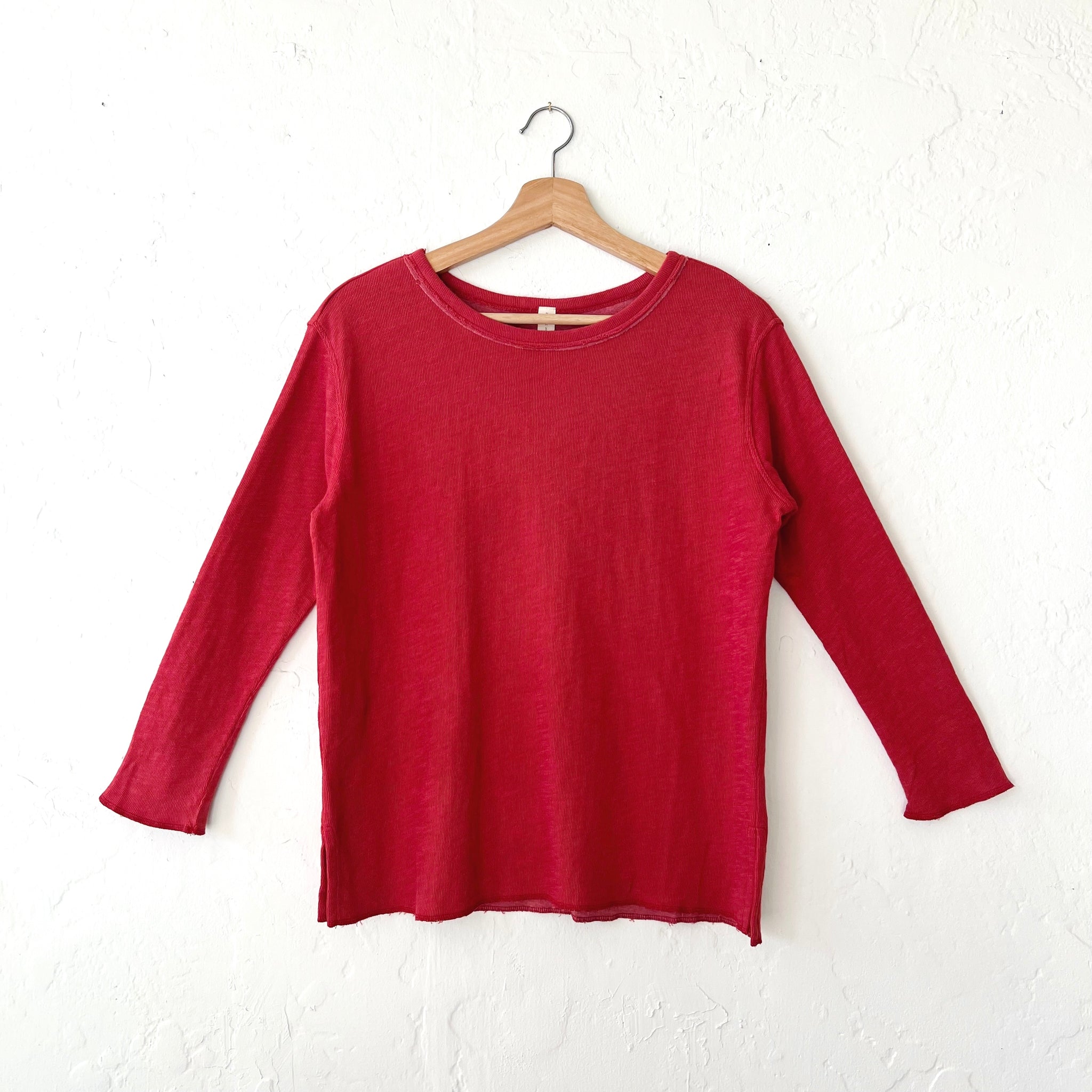 Cozy double-layered cotton top with raw hem neckline and slightly cropped sleeves.