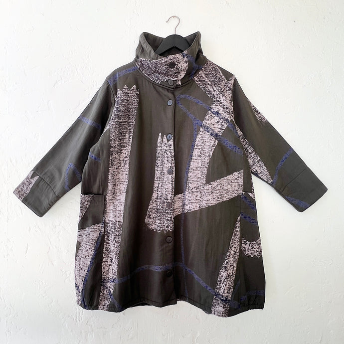 Mona Lisa | Cowl Neck Fleece Lined Jacket in Khaki Abstract Paint Print