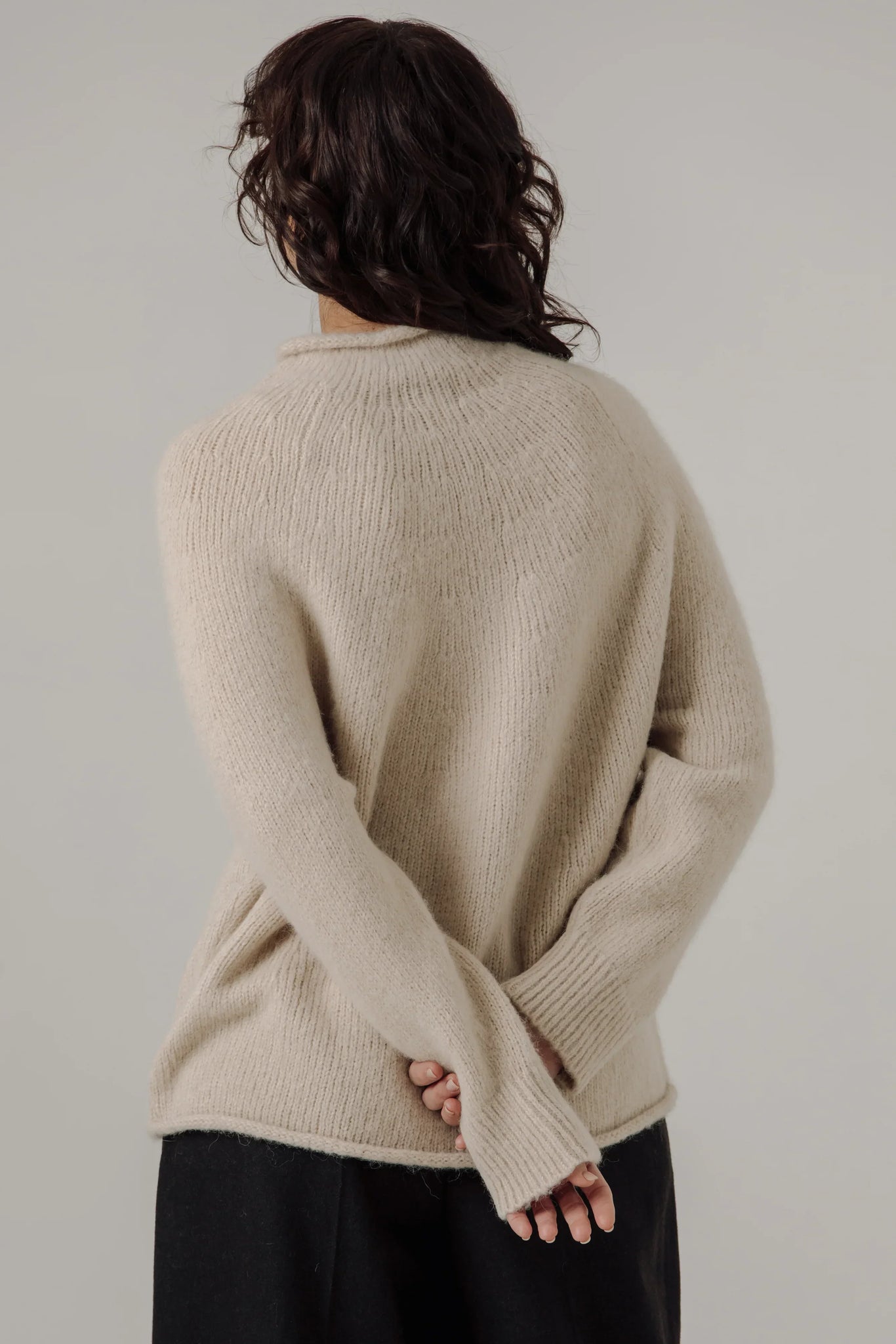 A timeless silhouette with a relaxed fit and refined finishes. Hand-loomed in Bare’s signature lofty, lightweight yarn, it features a seamless neckline and subtle fashioning details at the chest. The easy roll neck and generous raglan armhole make it ideal for effortless layering through the seasons.