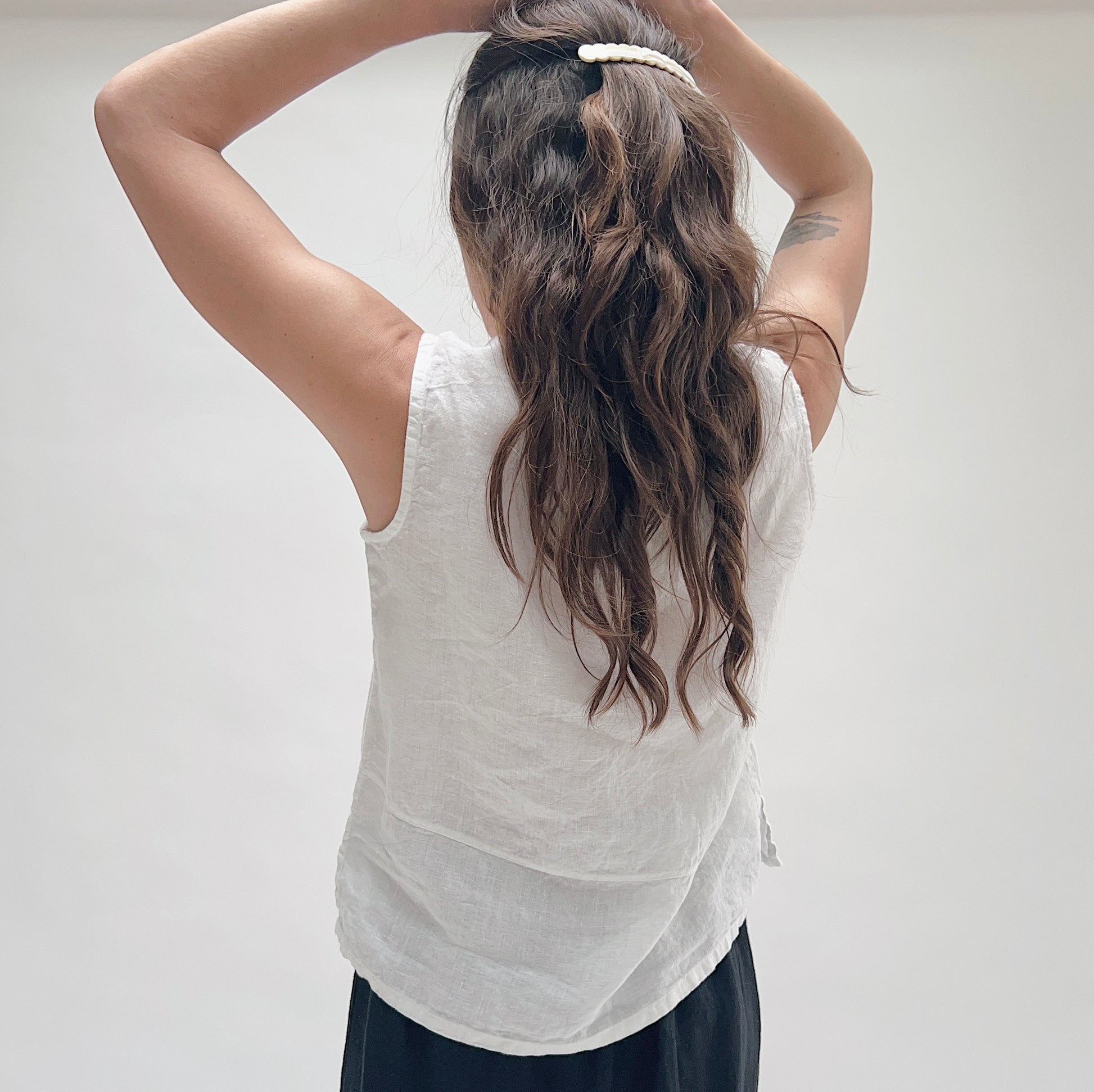 A perfect shell tank featuring a mother of pearl button closure at the back of the neck.