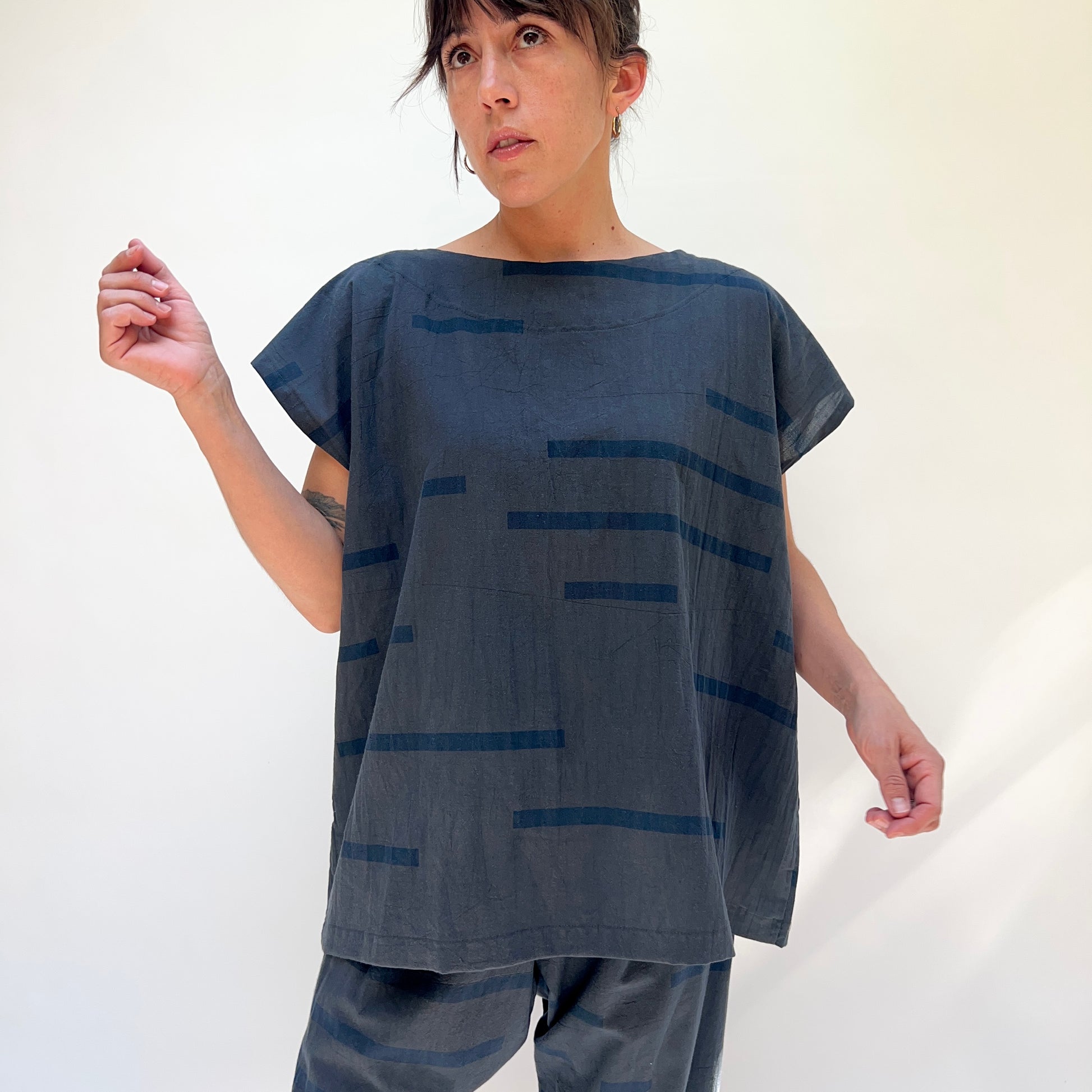 Loose-fitting tee with a black dashes printed on charcoal fabric. Variations in screen printing are to be expected and part of the hand made nature of this fabric.
