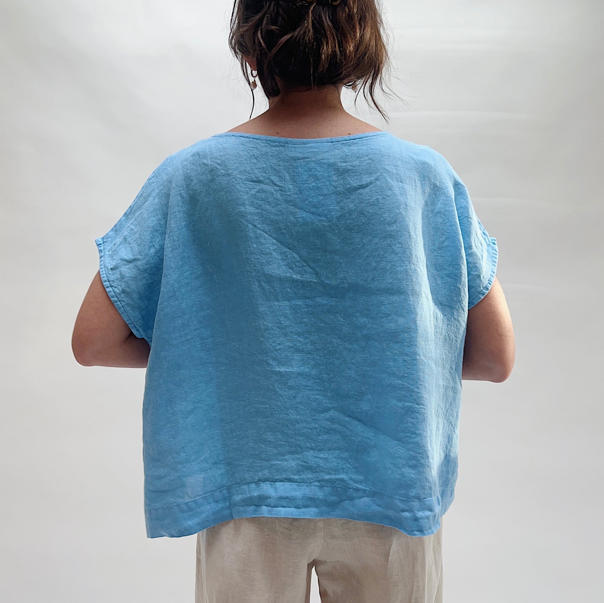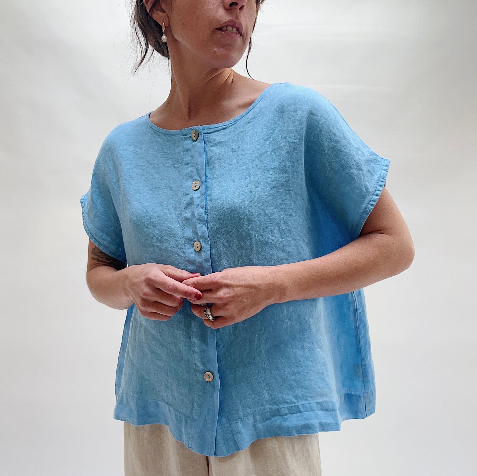 A lovely spring, summer top in soft linen with shell buttons down the front.