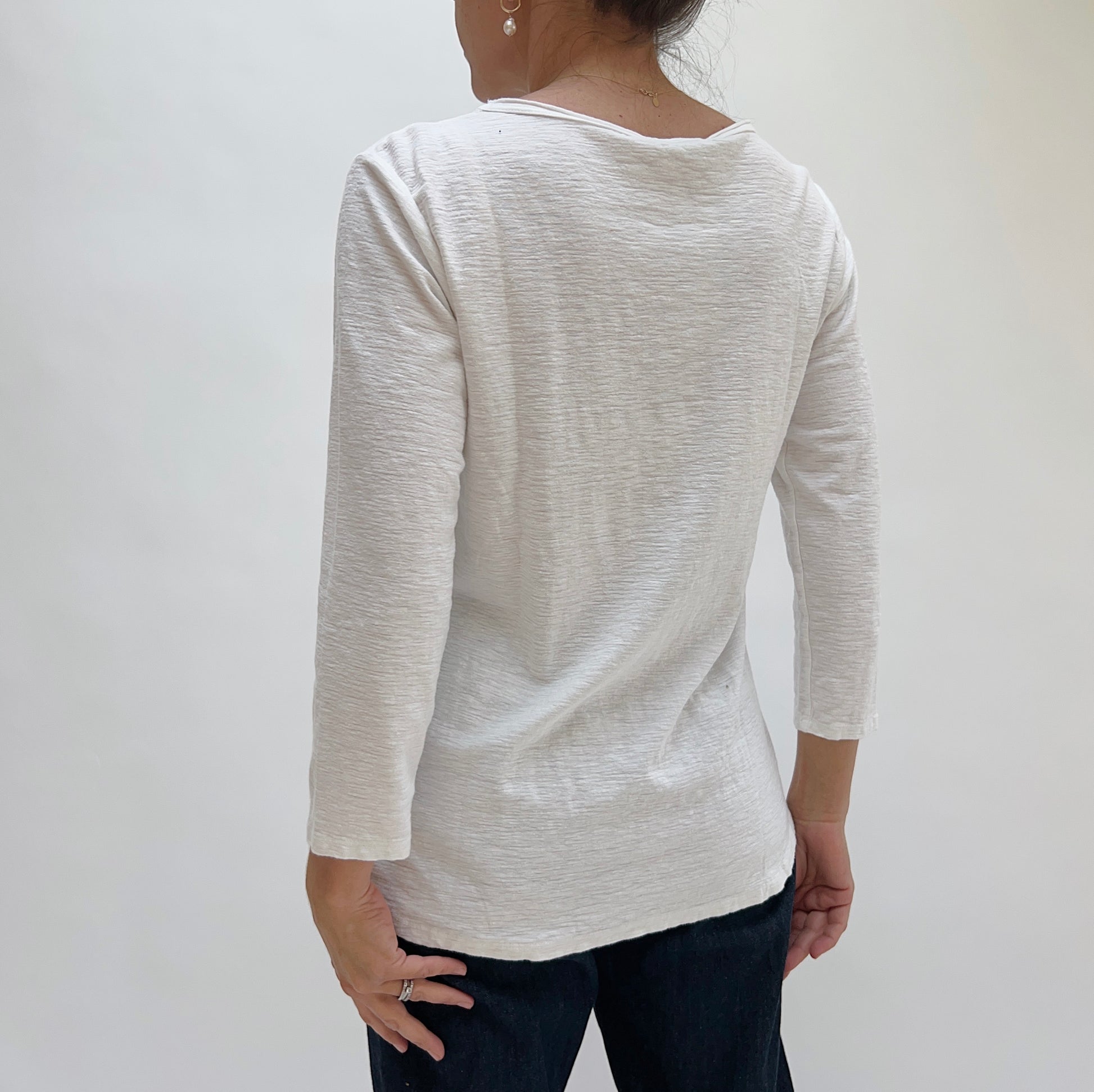 This 3/4 sleeve tee features a raw hemmed v-neck collar and pairs with just about anything!