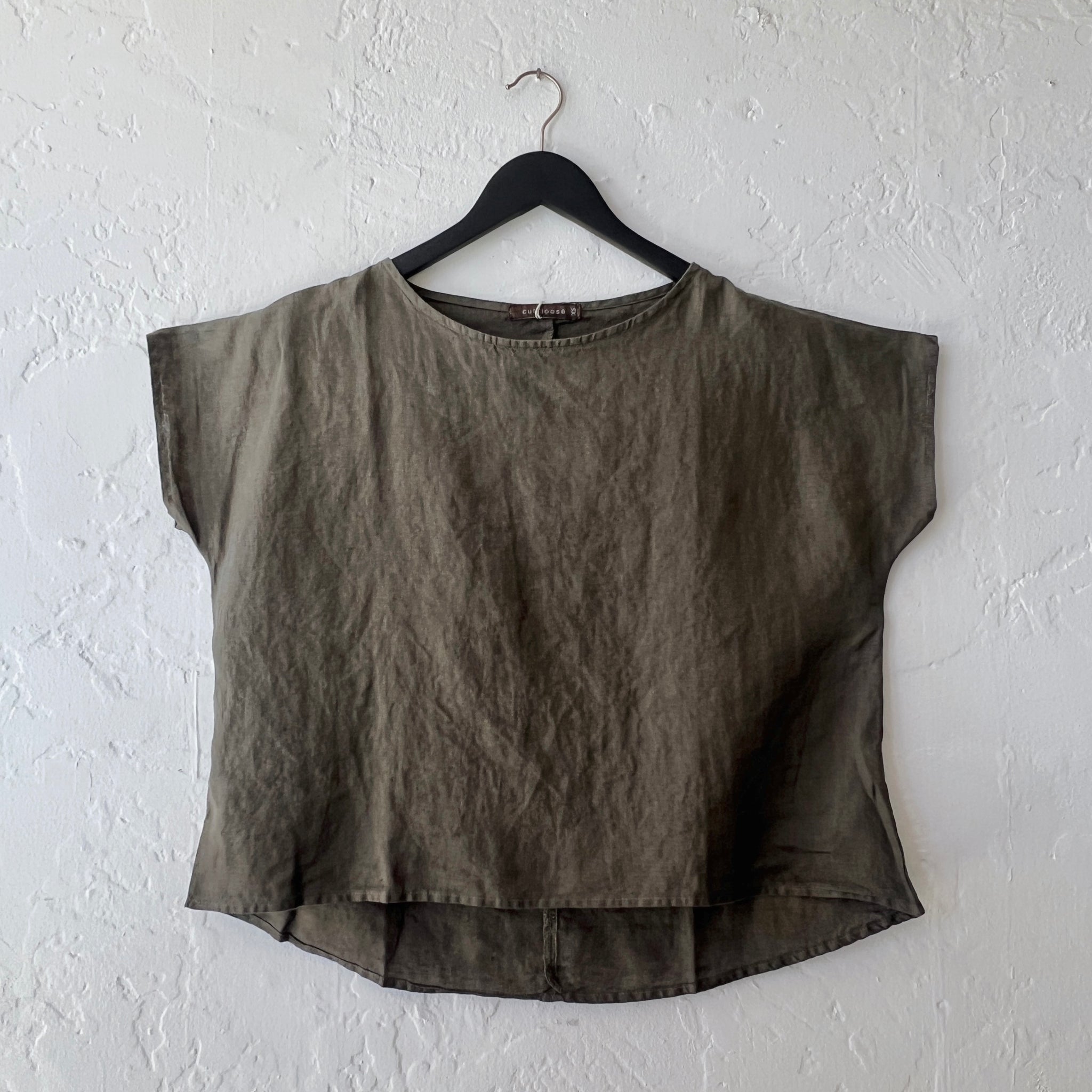 The perfect chic and easy linen tee with a high-low hem from front to back and a flattering boatneck. Kelp is a deep seaweed green color.