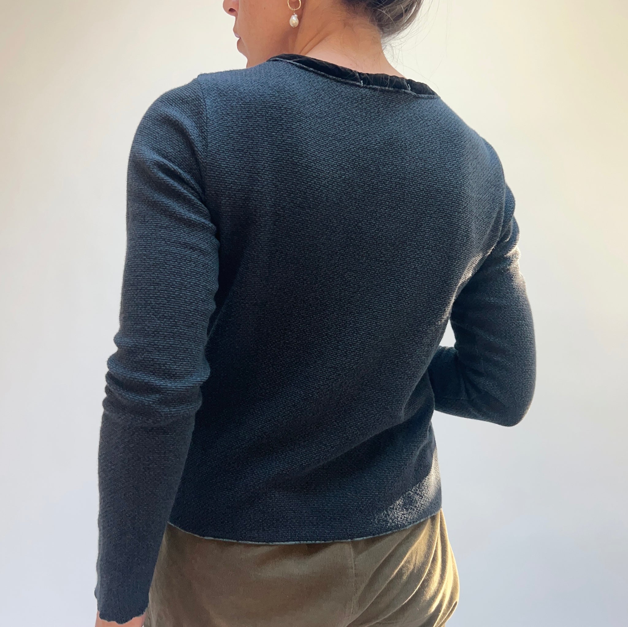 A slightly cropped cozy knit cardigan with luxurious silk velvet trim around the neckline, two velvet pockets on the bottom, and shell button closures.