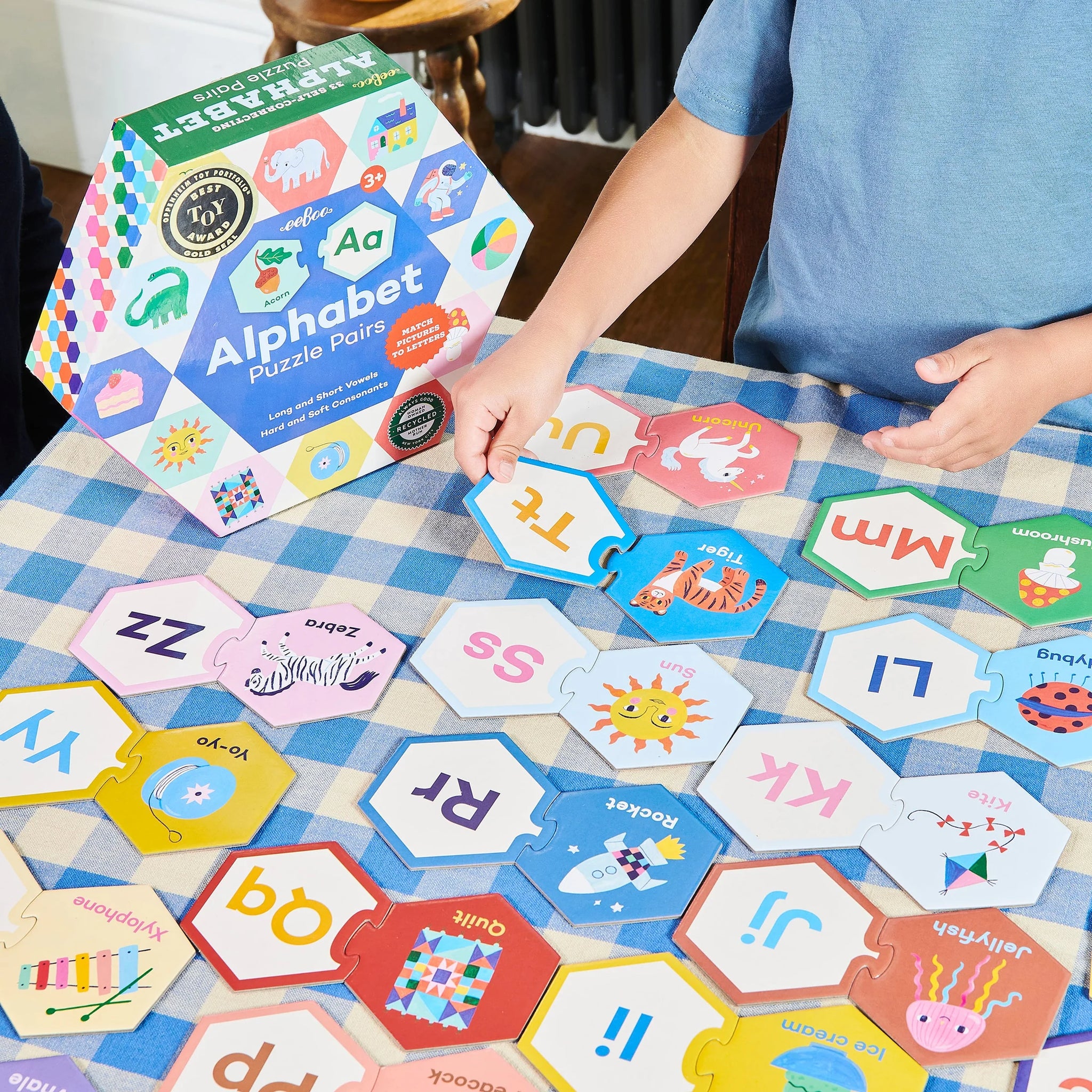 Simple skill building activities that help to prepare children for learning to read, featuring colorful, accessible illustrations. Self-correcting hexagon-shaped puzzle pieces allow children to test and explore their knowledge of the alphabet and the sounds its letters stand for.