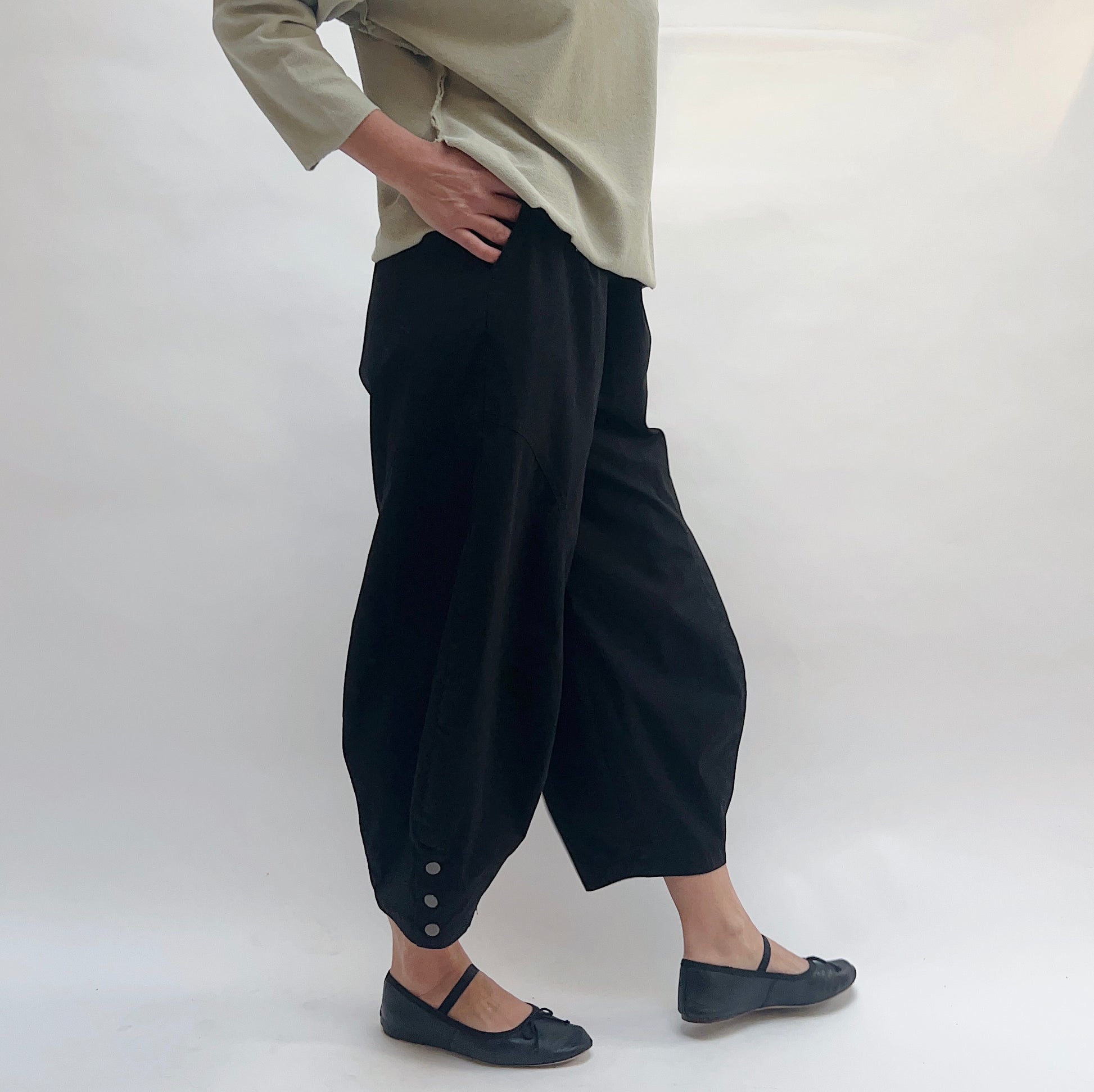 Perfectly cotton/lyocell pants featuring roomy pockets, an elastic waistband, side-seam detailing, and snap buttons at each ankle. These pants are comfortable while looking polished and cool - a pair you'll want to throw on again and again!