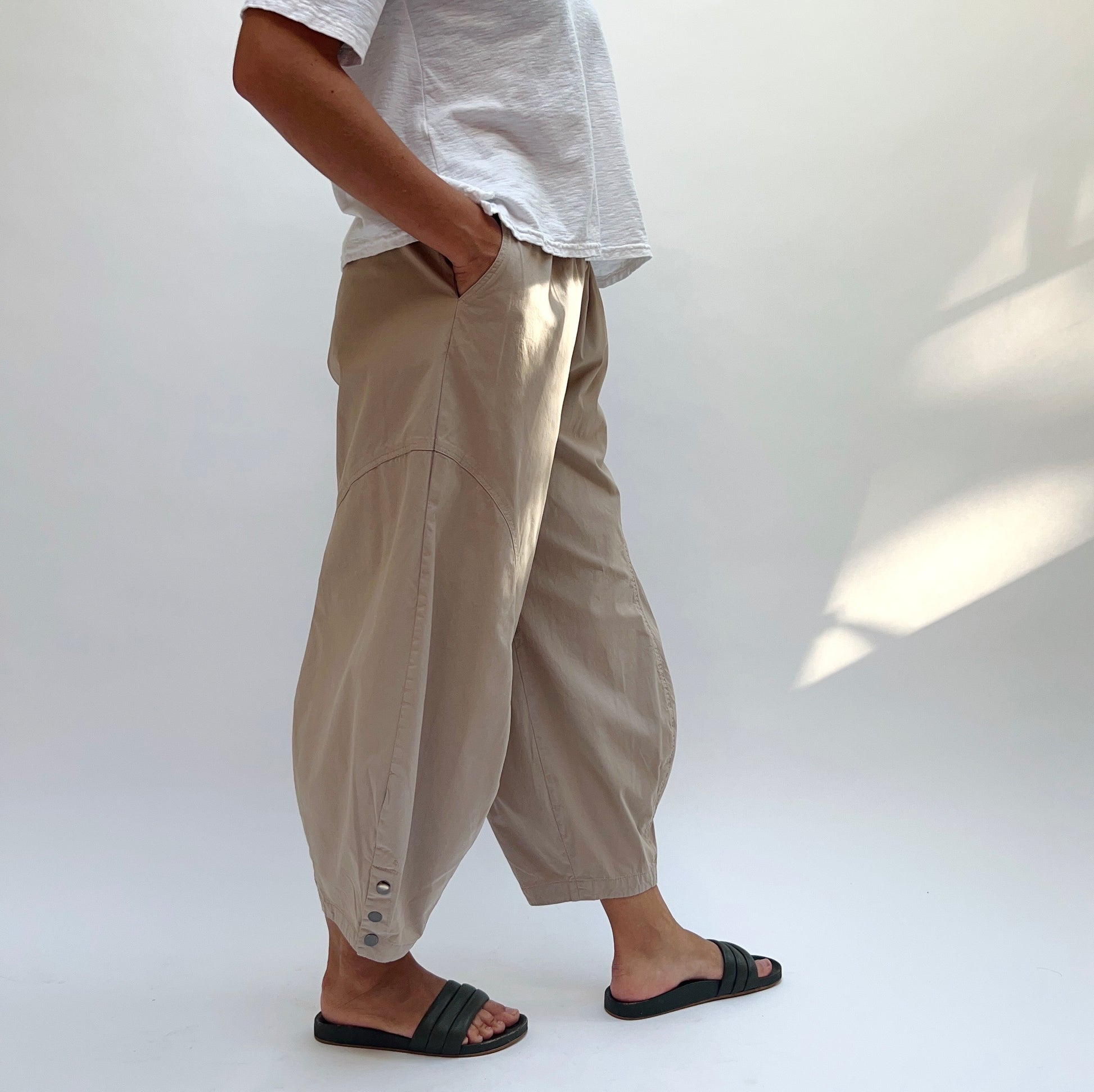 Perfectly cotton/lyocell pants featuring roomy pockets, an elastic waistband, side-seam detailing, and snap buttons at each ankle. These pants are comfortable while looking polished and cool - a pair you'll want to throw on again and again!