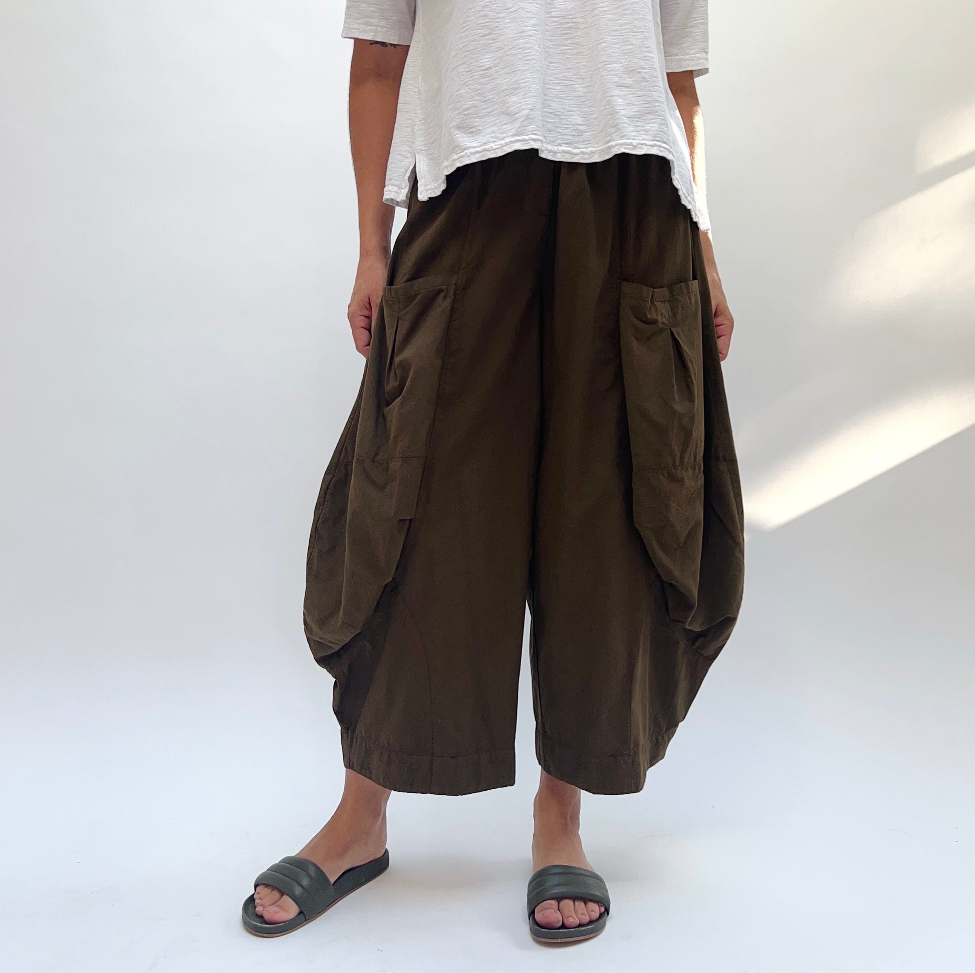 Crisp cotton pants featuring roomy pockets, an elastic waistband, and layered pockets at two different depths. These pants are the ultimate hybrid of comfortable, practical, and modern.
