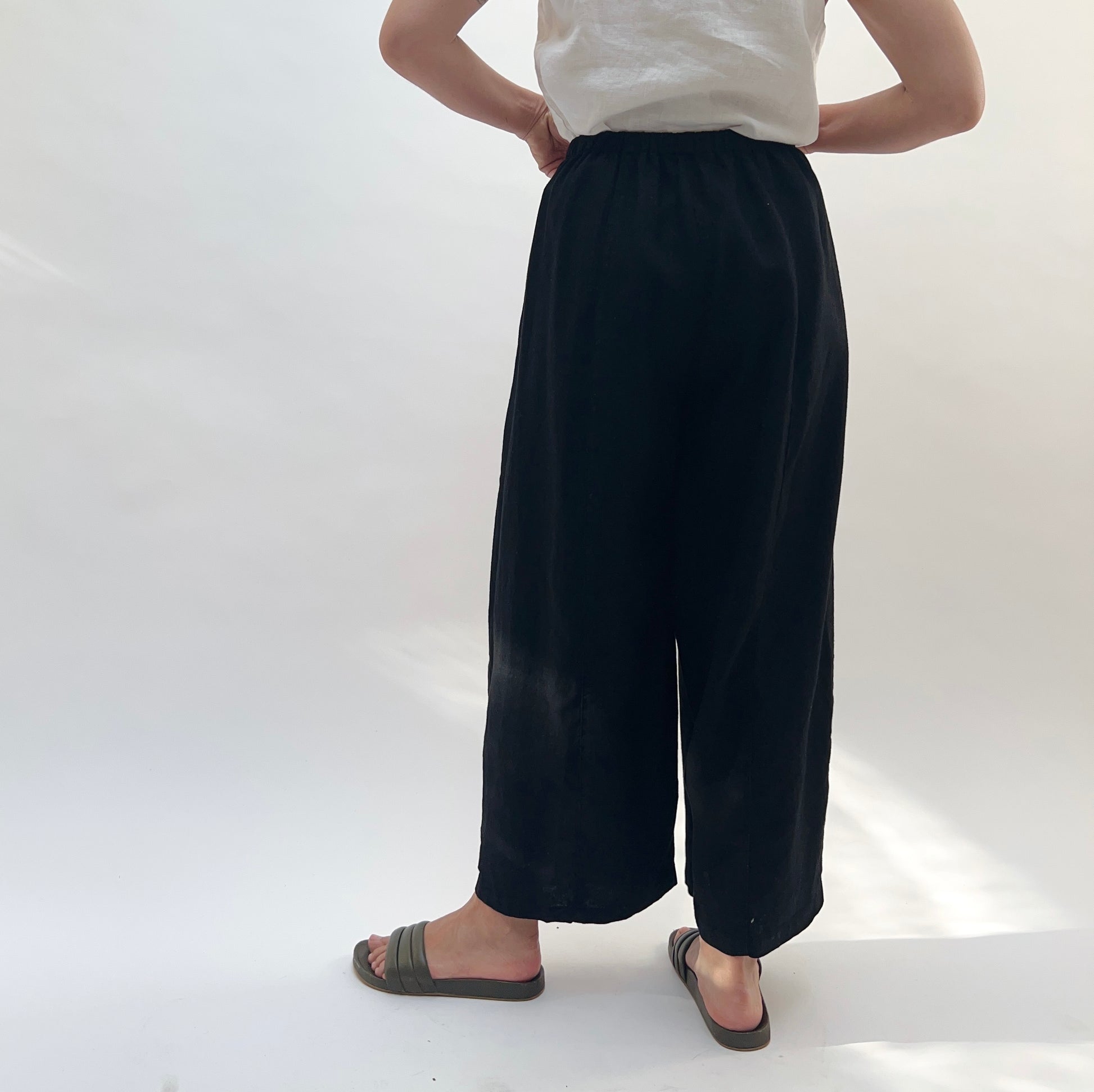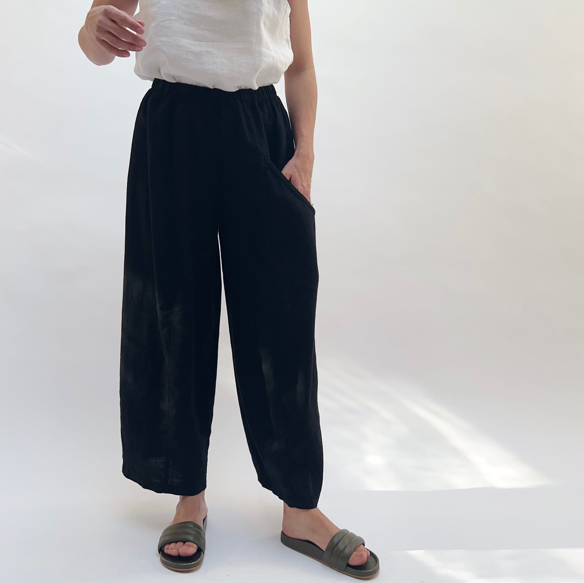 A lightweight take on Eleven Stitch's classic curved seam pant. With one large pocket on the side.