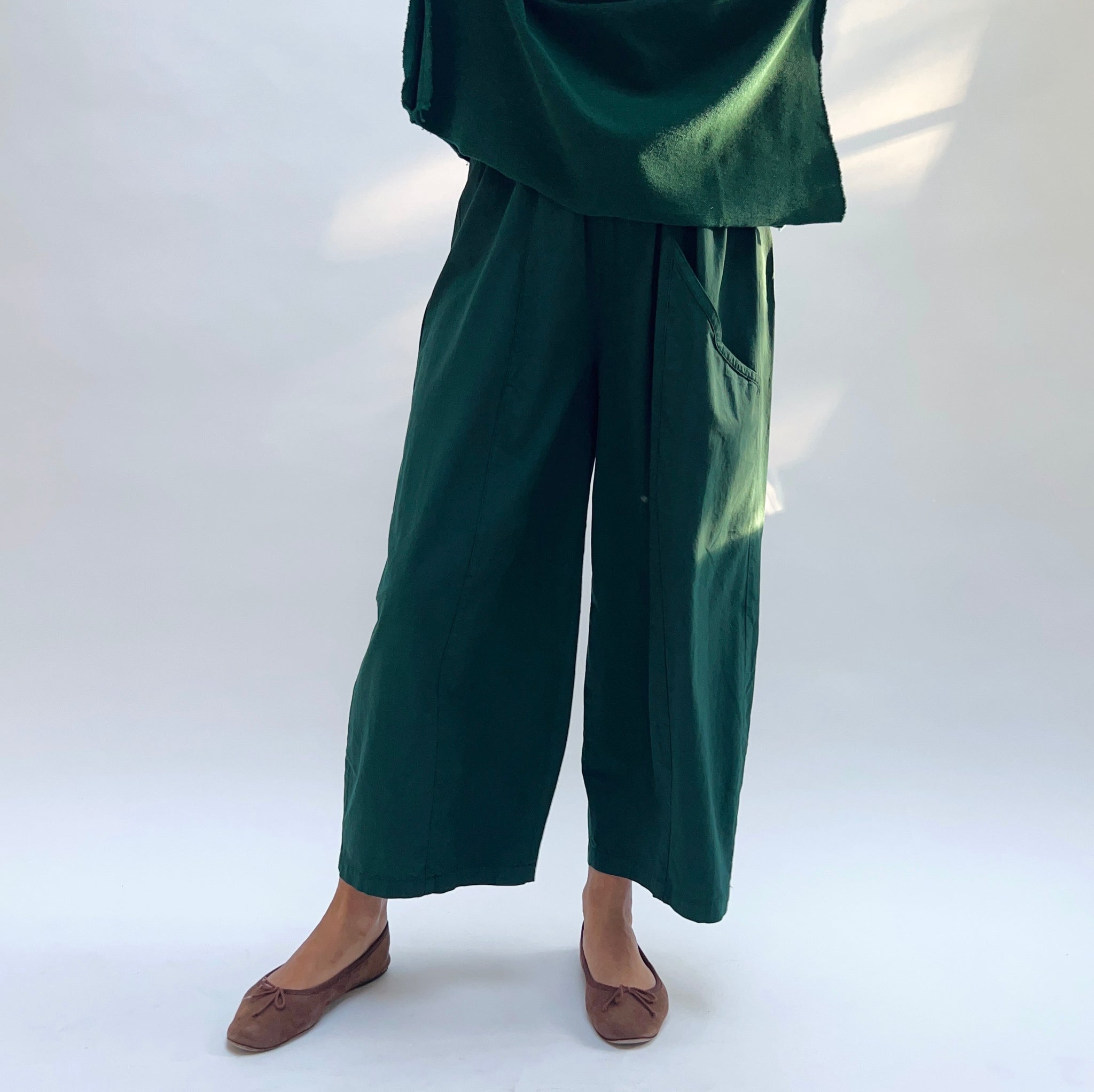 A lightweight take on Eleven Stitch's classic curved seam pant. With one large pocket on the side.