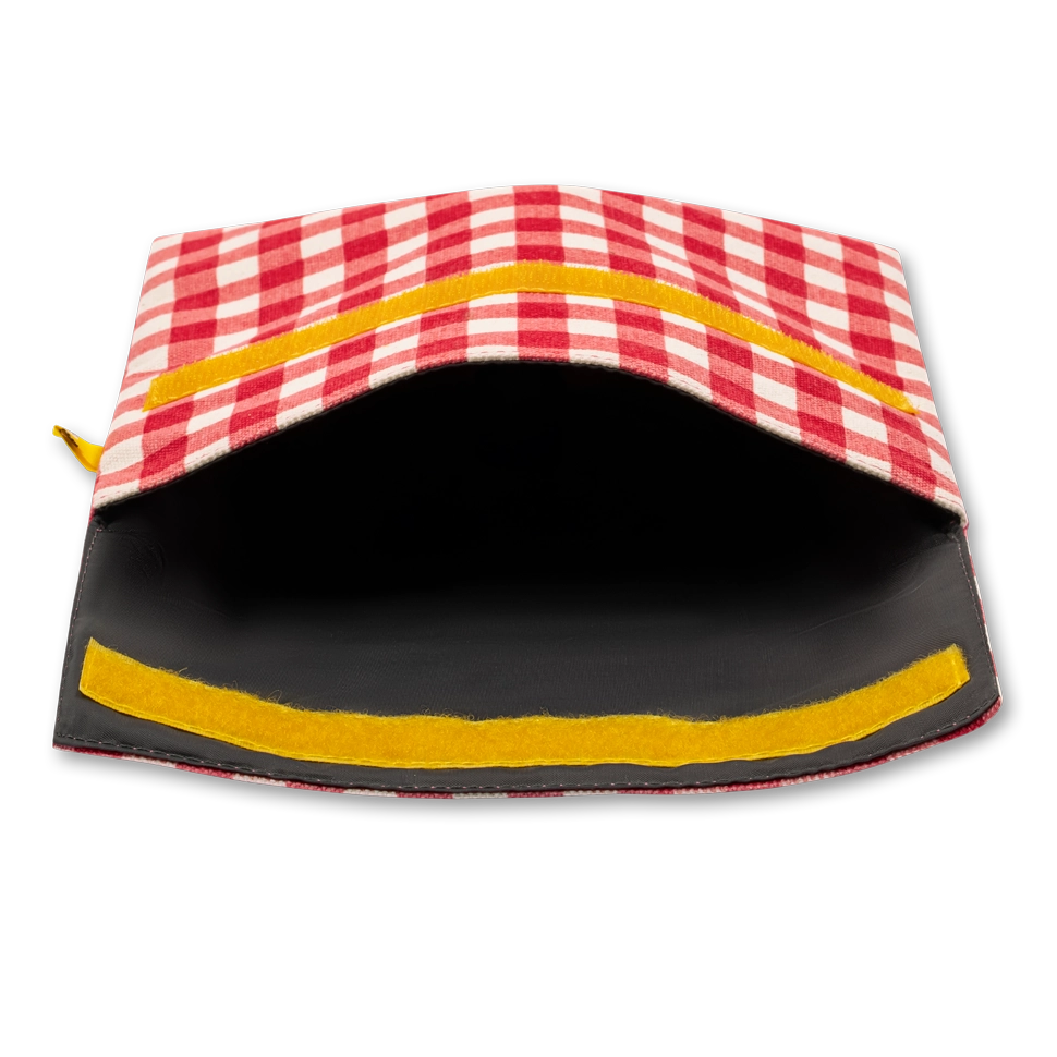 Stylish, reusable food bag for kids and adults. Safe and non-toxic. Hook and loop (velcro) closure. Fully machine washable and easy to clean. Rinsable, tested food-safe lining. Sustainably and ethically made with organic + recycled materials. Can be used hundreds of times and replaces single-use plastic bags.
