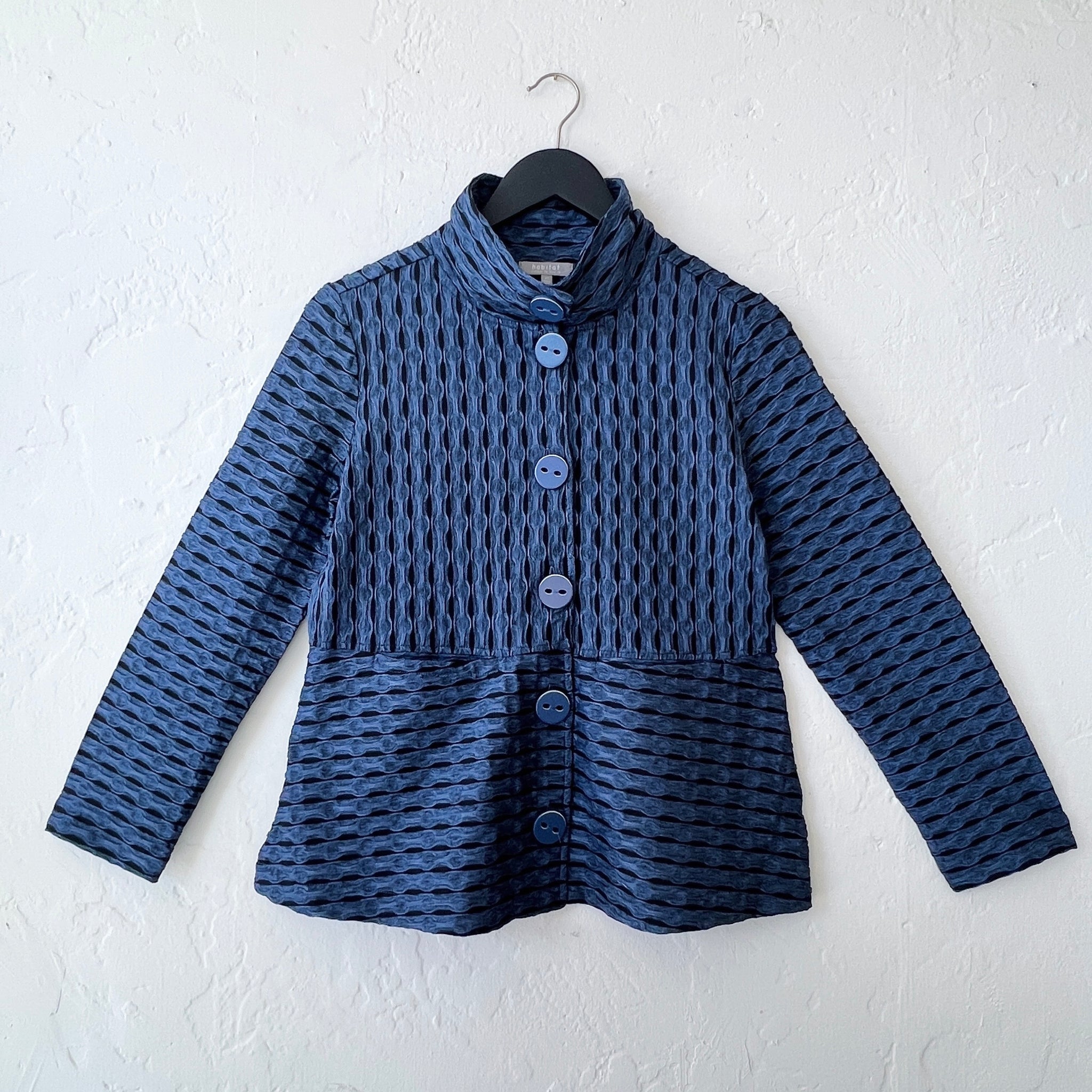 A lightweight jacket with a structured look. Featured oversized buttons dyed to match fabric and hidden pockets.