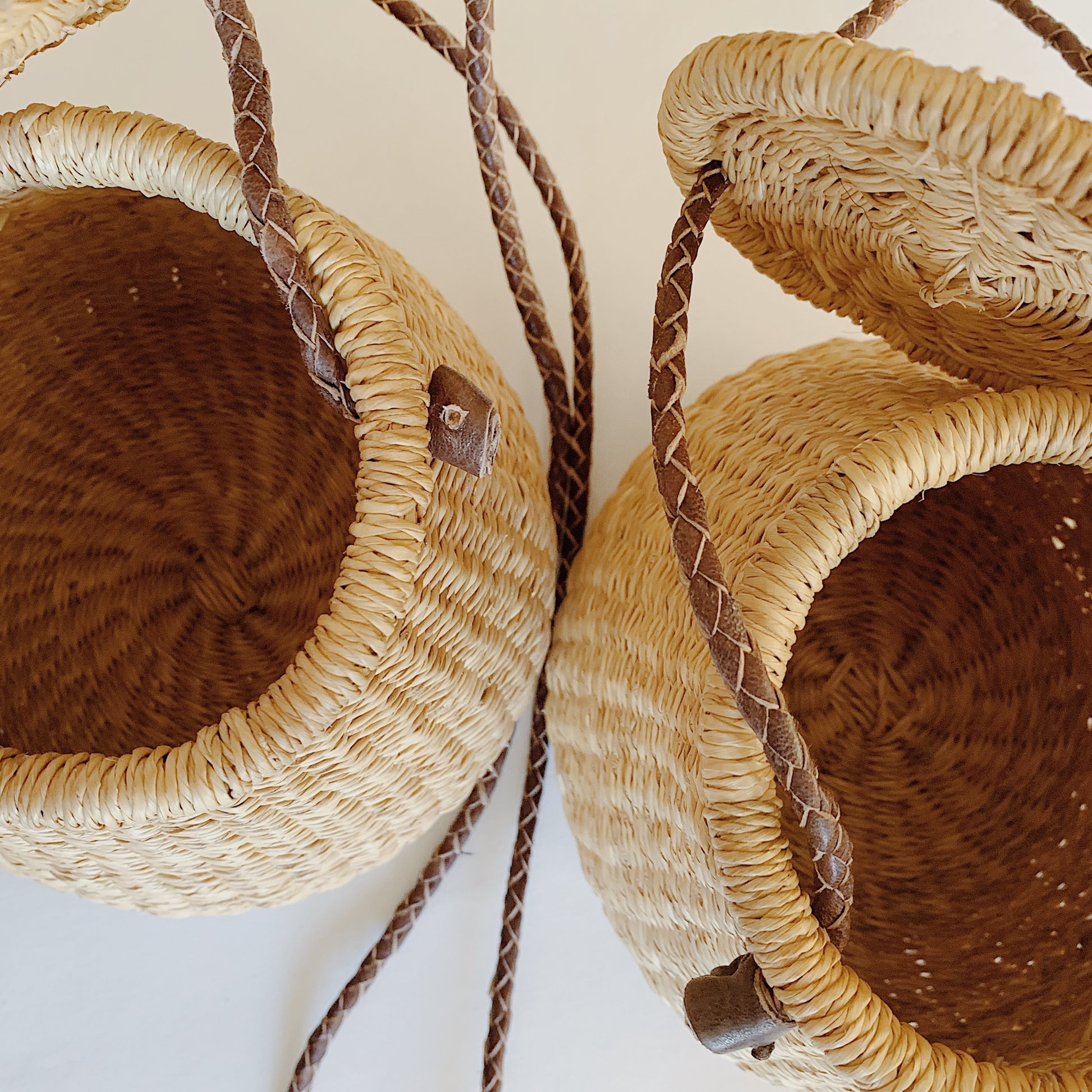 Talented basket weavers in Ghana's northern region weave this sweet basket purse from thick, tough elephant grass, also known as veta vera grass. A soft leather braided strap secures the sliding lid.