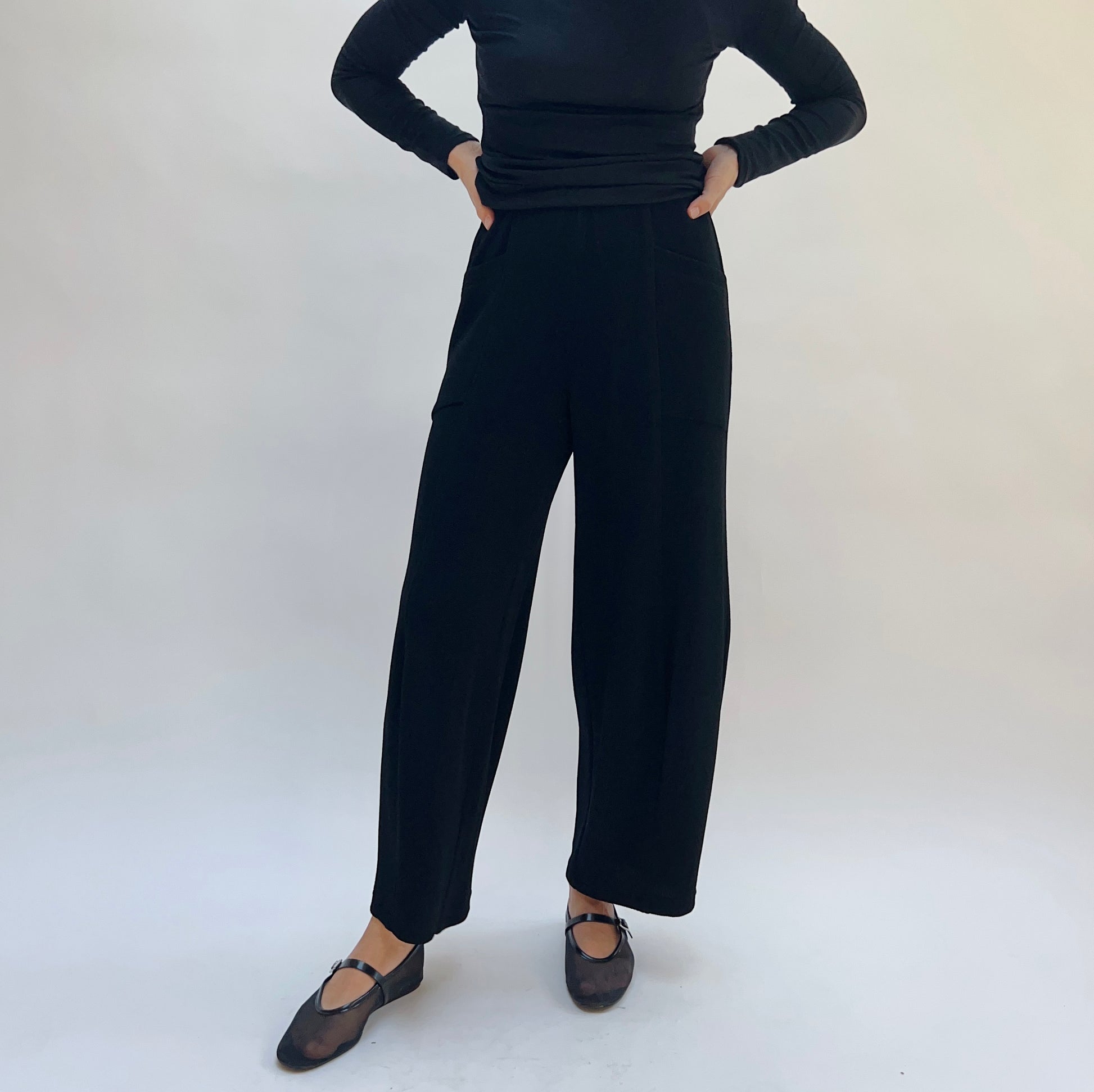 Chic and easy to wear pants featuring two pockets, front seam detailing, and a slight lantern hem.