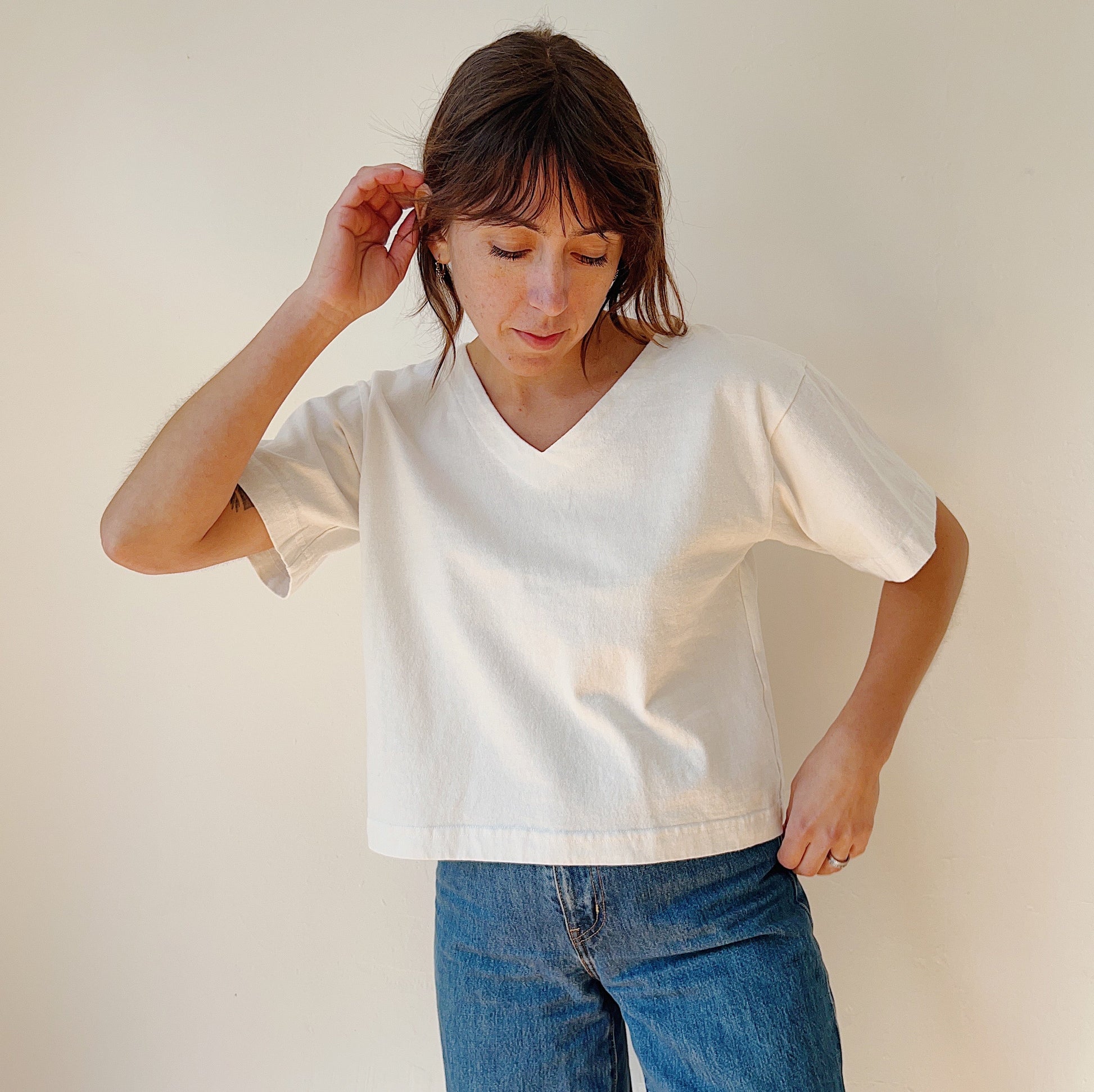 Cropped sleeve top with a slight v-neck in Pacific Cotton's signature long-lasting heavy weight cotton.
