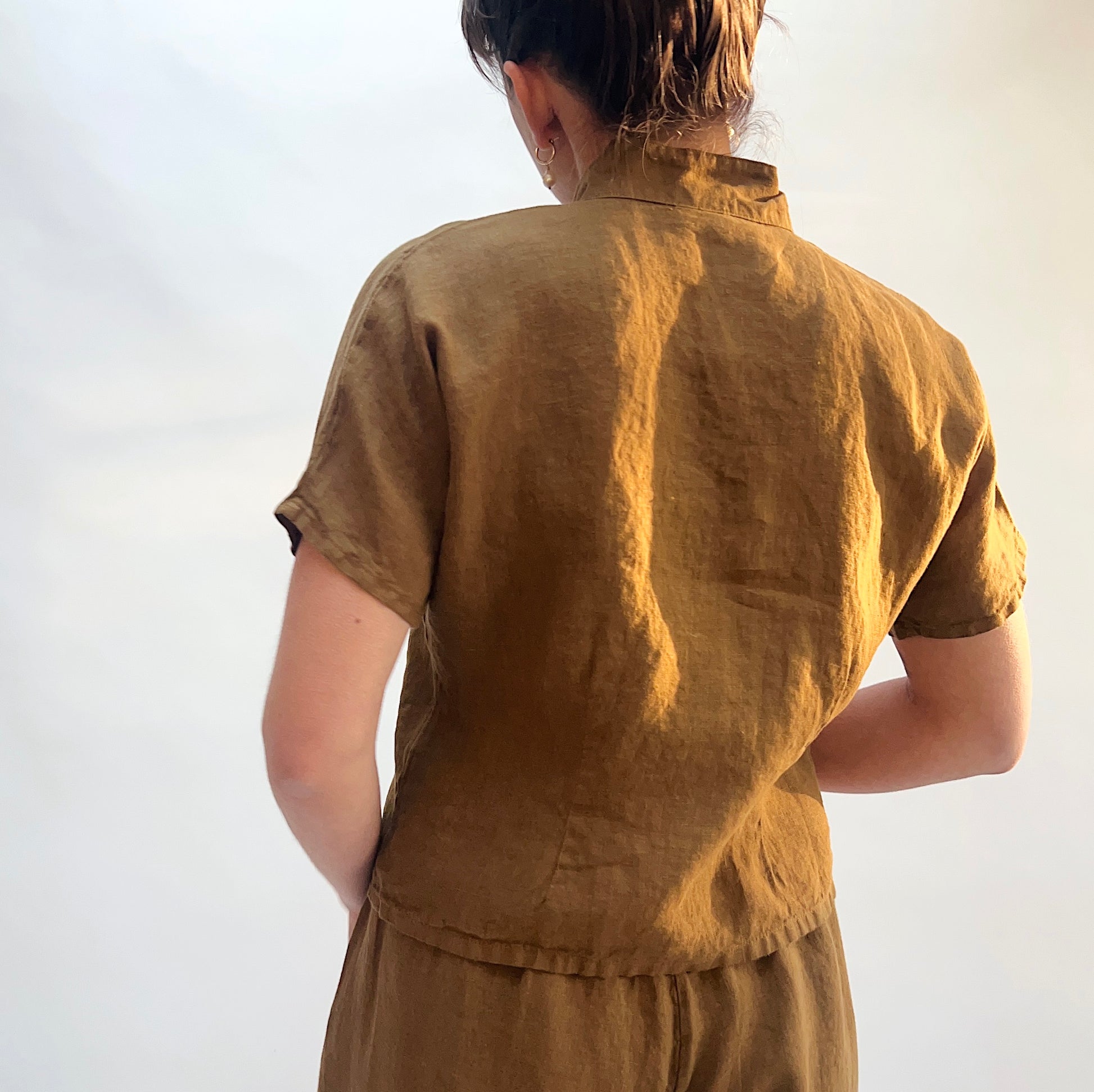A fitted light linen blouse with shell buttons down the front and a standing collar.
