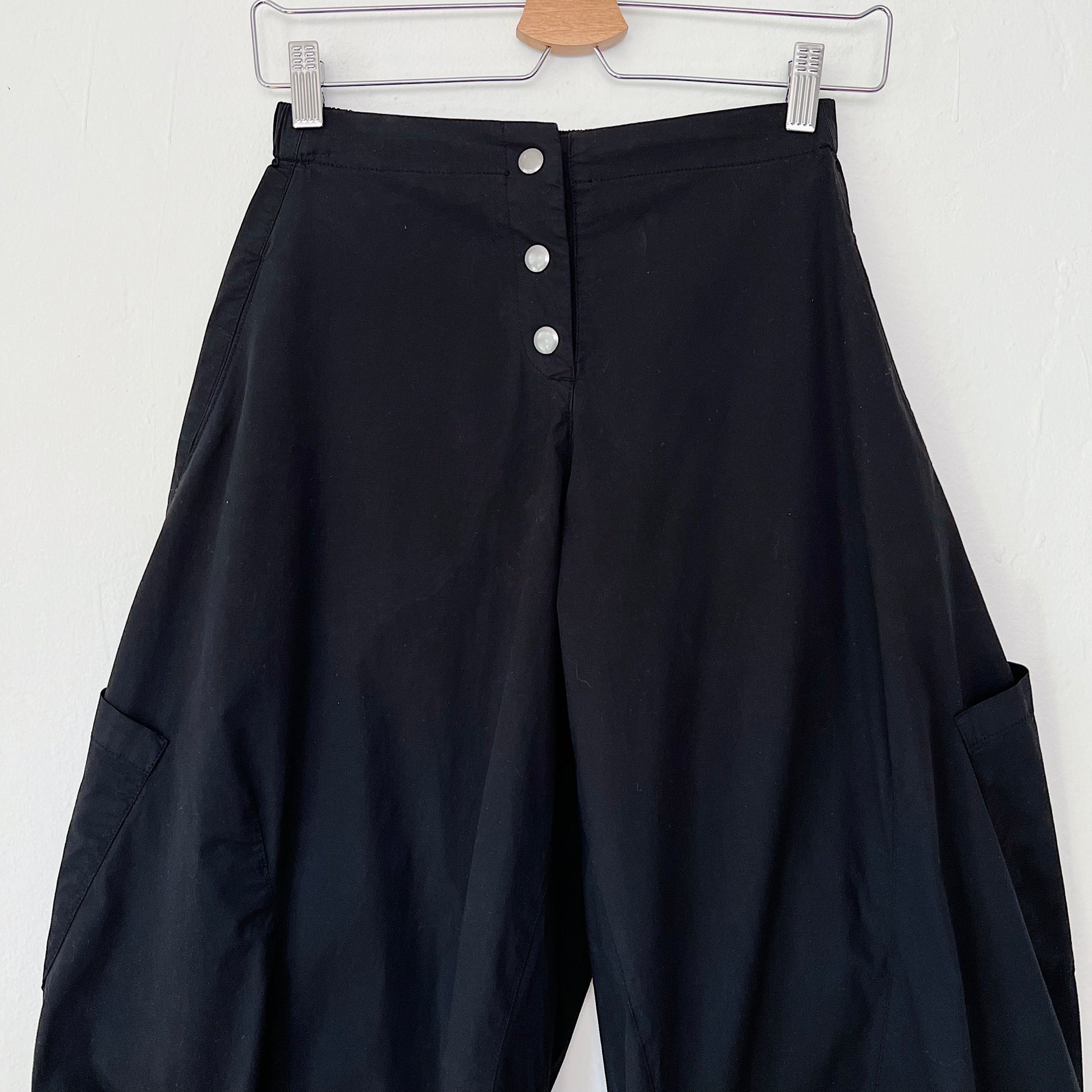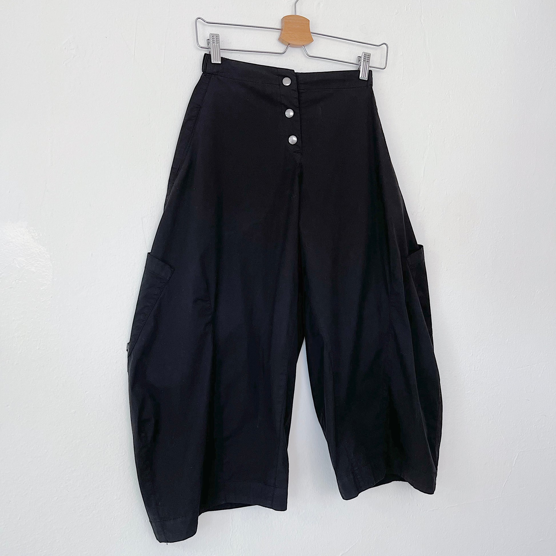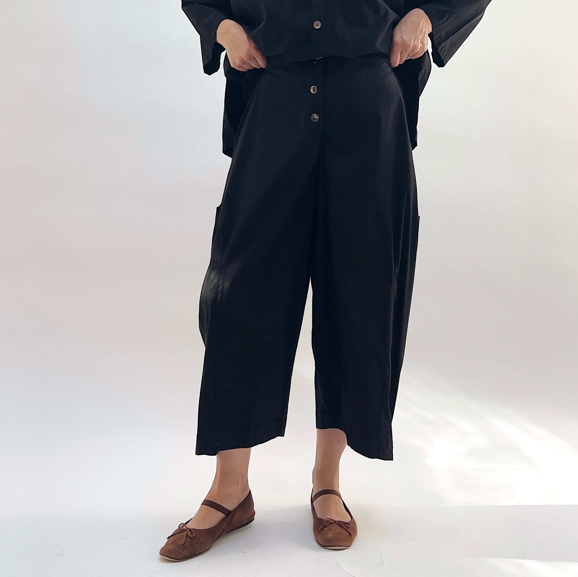 Crisp cotton pants with a snap front waist and elastic across the back of the waist.