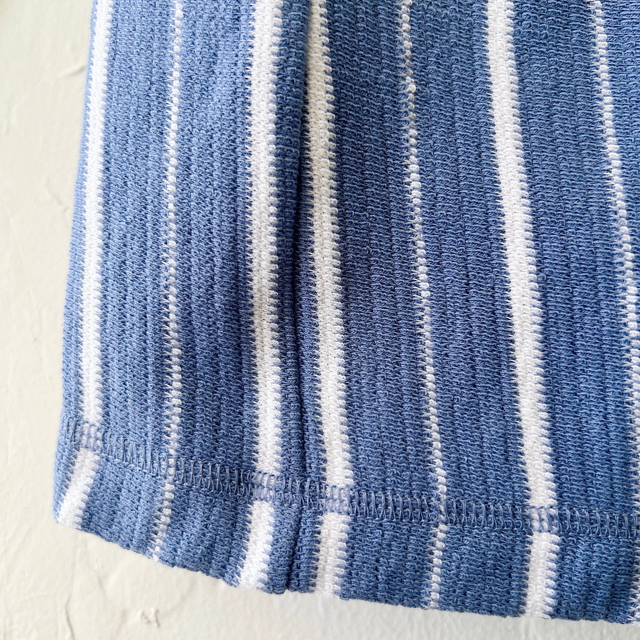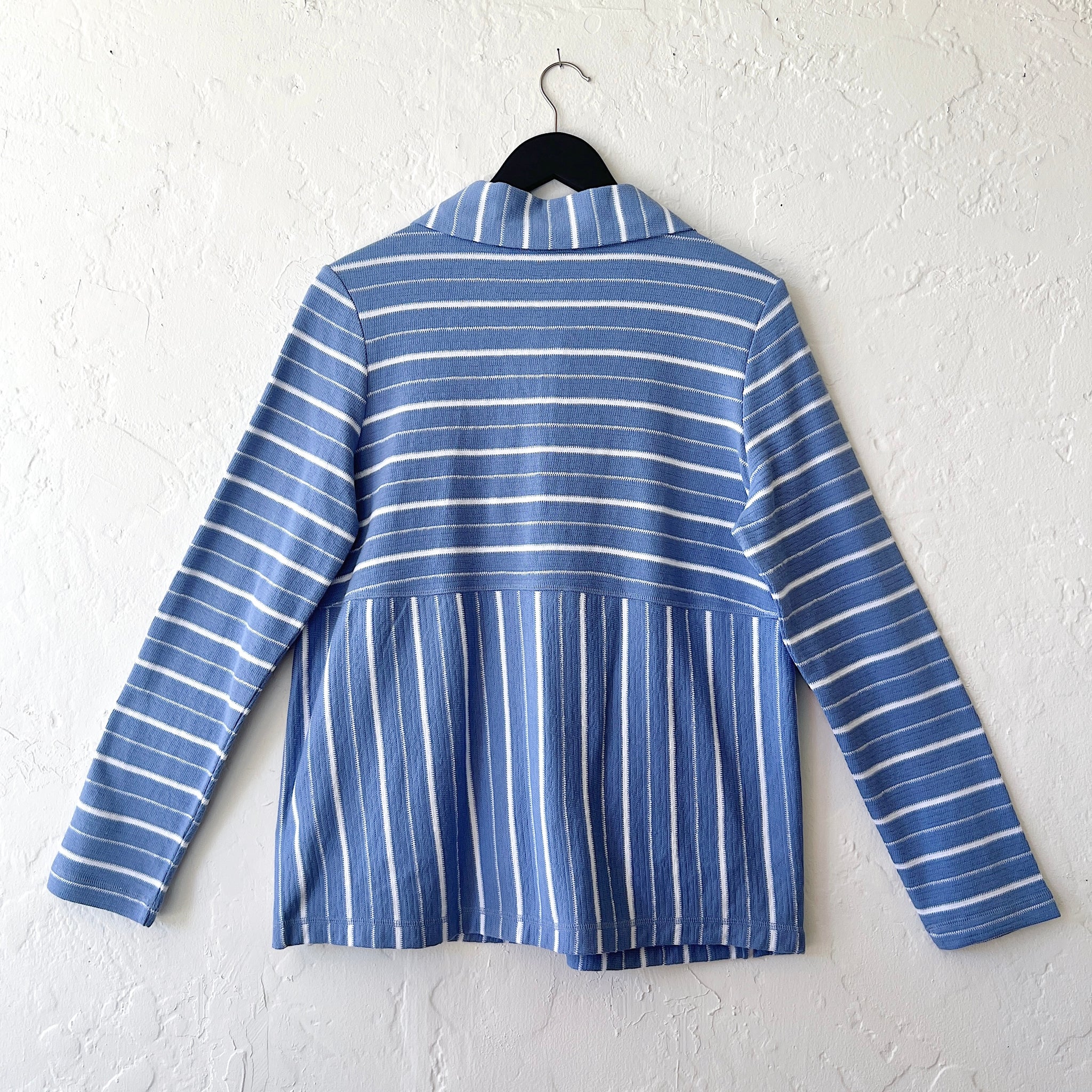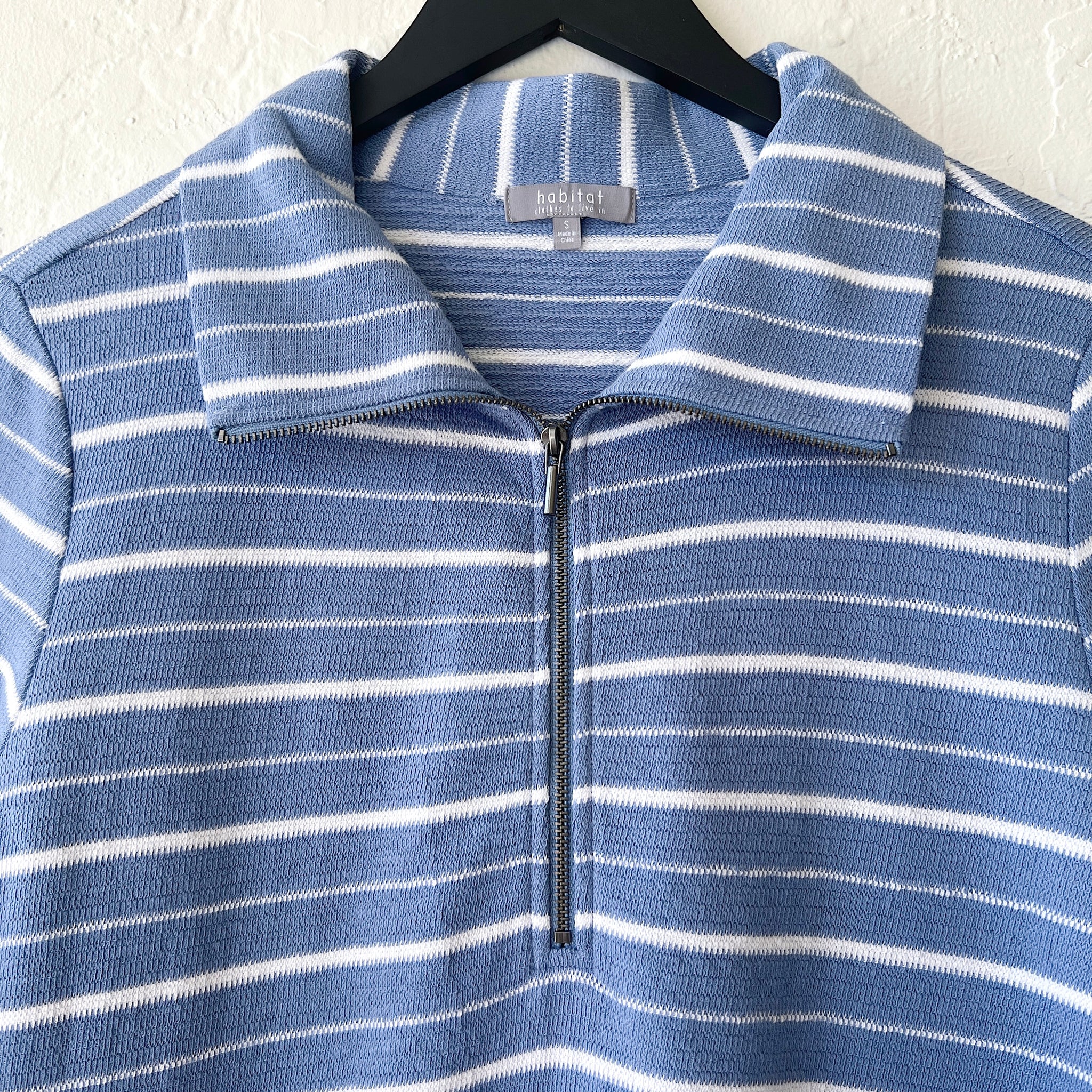 A nautical-inspired treasure that’s as cozy as it is chic. Crafted from soft, textured French terry cotton in a watery blue, this quarter-zip pullover with a folded collar brings timeless stripes to life with a playful twist. The mixed-piece bodice showcases vertical and horizontal stripes for a fresh, eye-catching look. Designed for comfort and versatility, it features long sleeves, two hidden on-seam pockets, and a straight hem that falls at the hip. Perfect for weekend adventures and beyond.