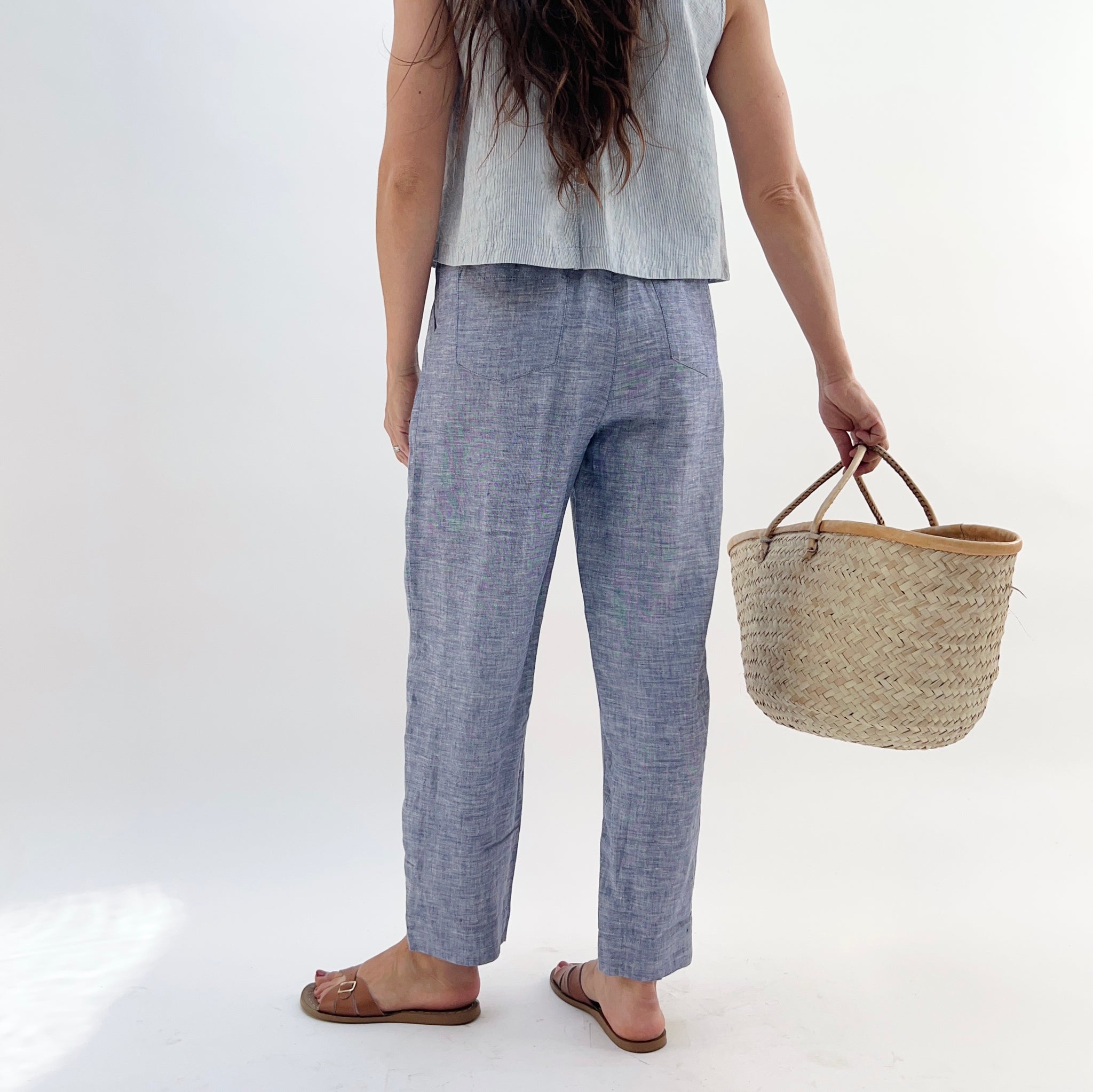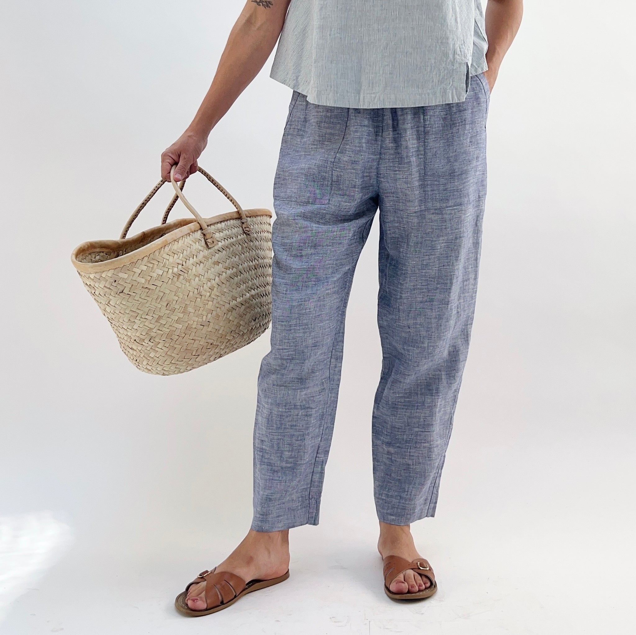 Linen pants featuring a an elastic waist, a tapered leg, two front pockets, and two back pockets.